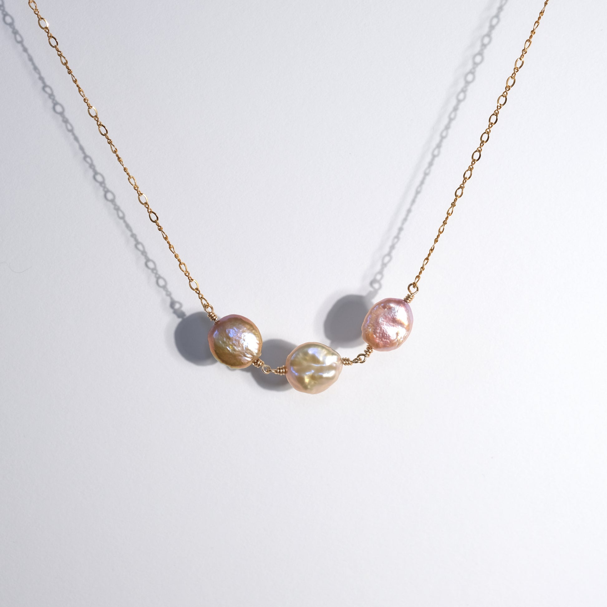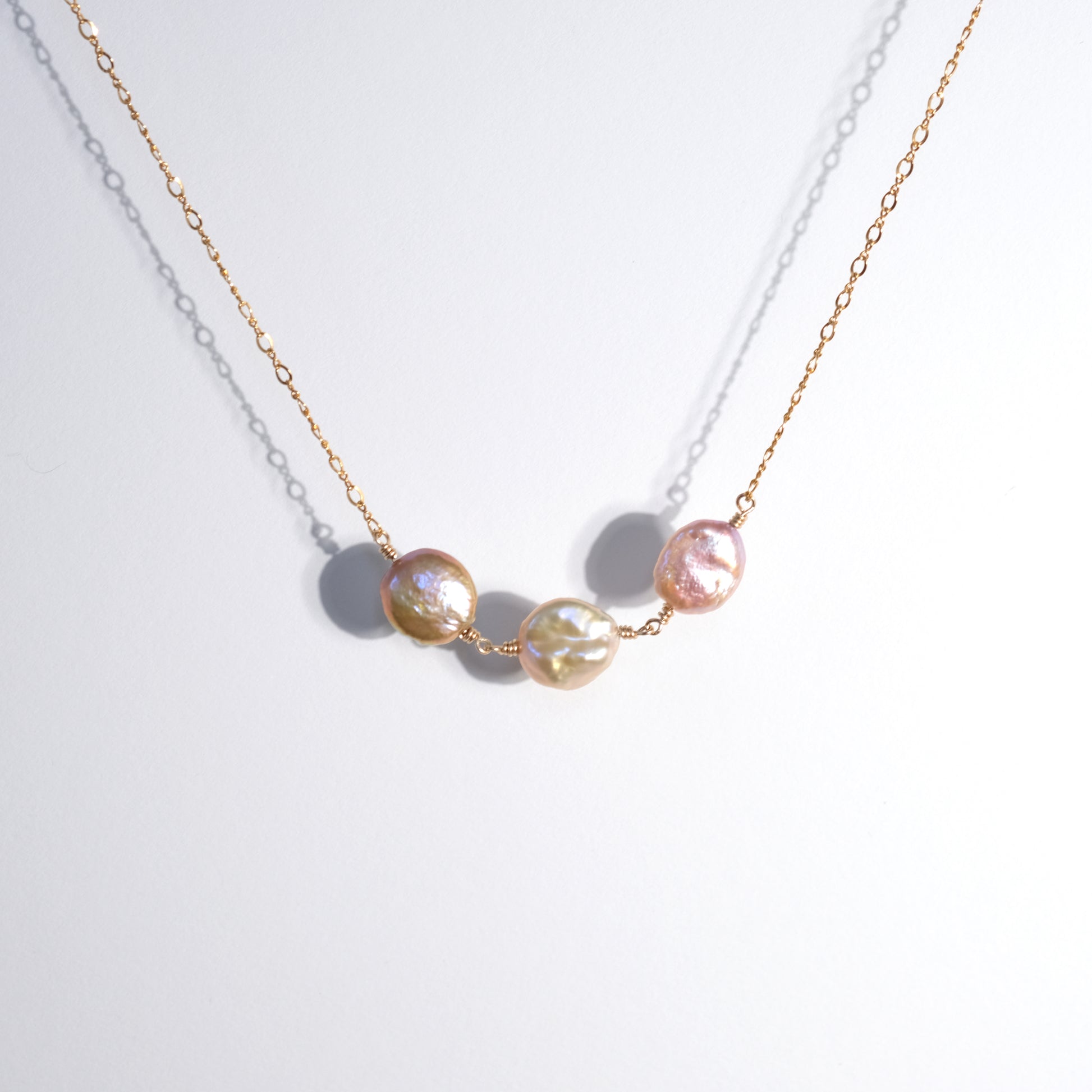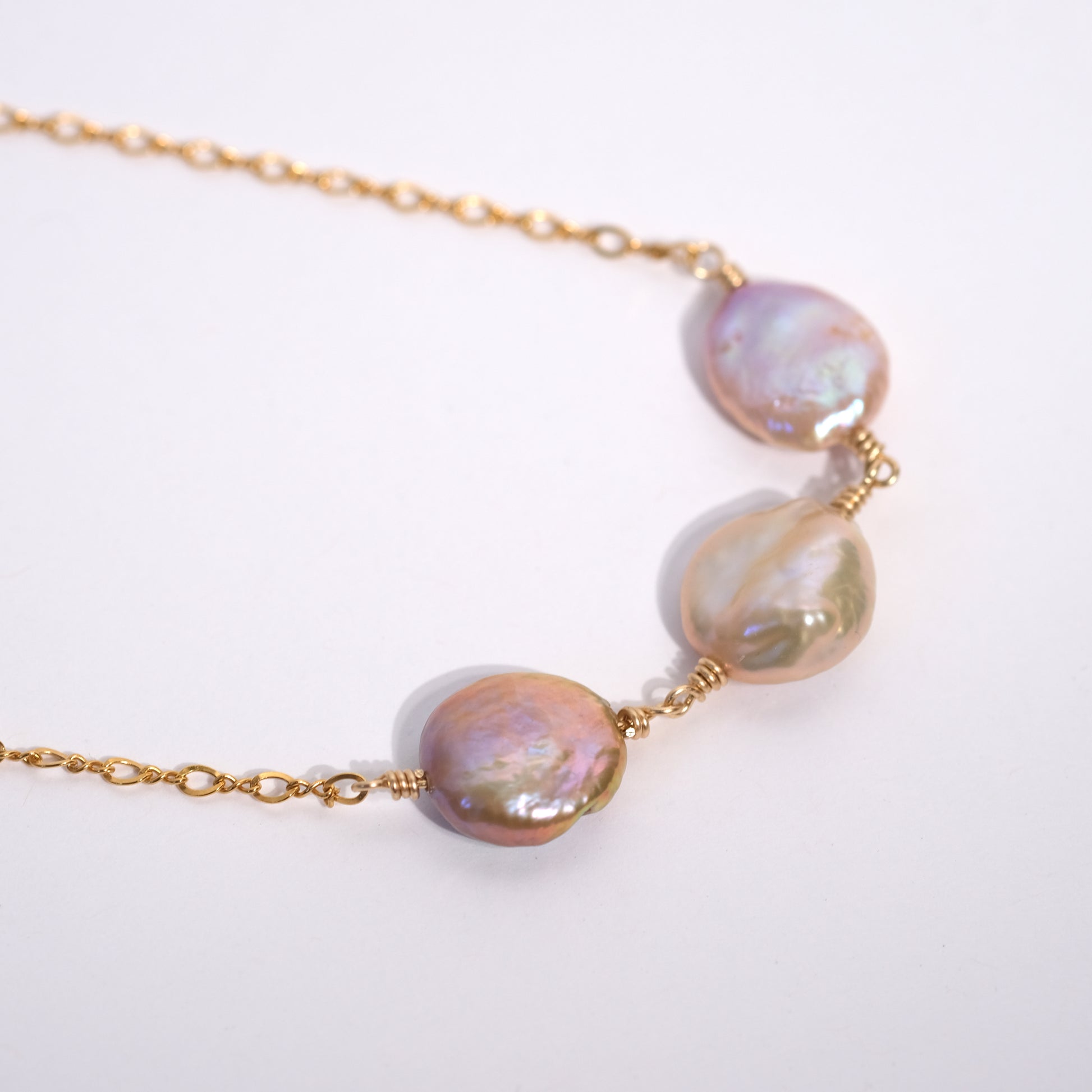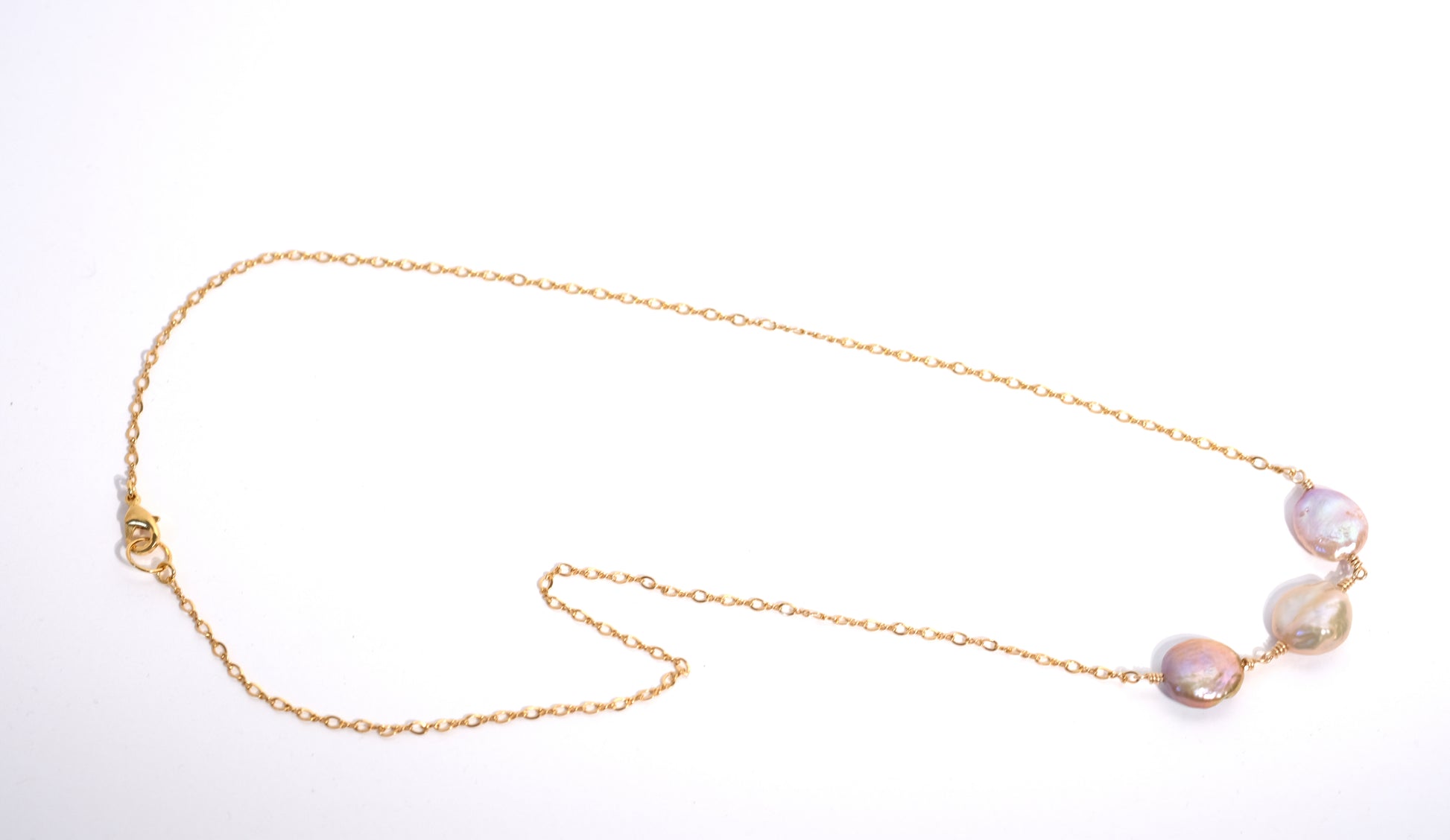 Freshwater pearl coins have natural variations and reflect subtle yet beautiful colors. Chain is 14k gold filled "figure 8." Gold plated lobster clasp. Necklace measures 23" including clasp.