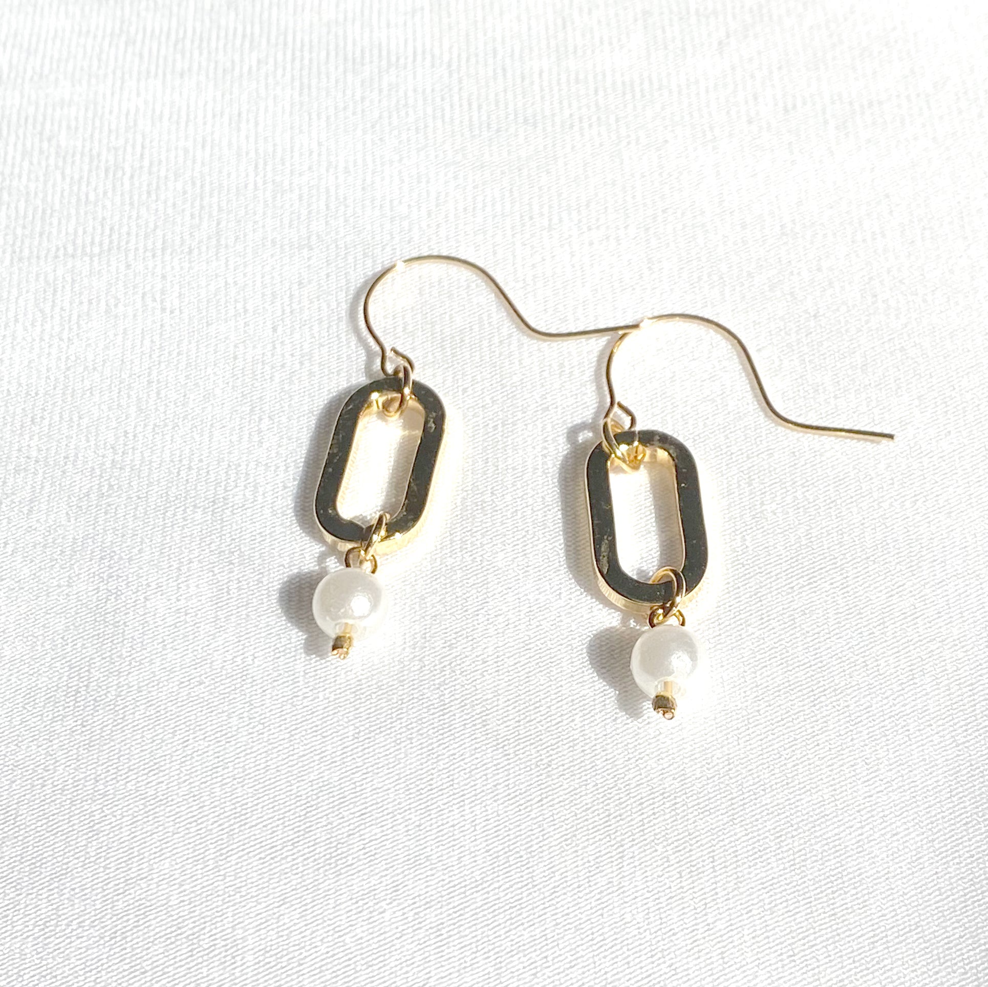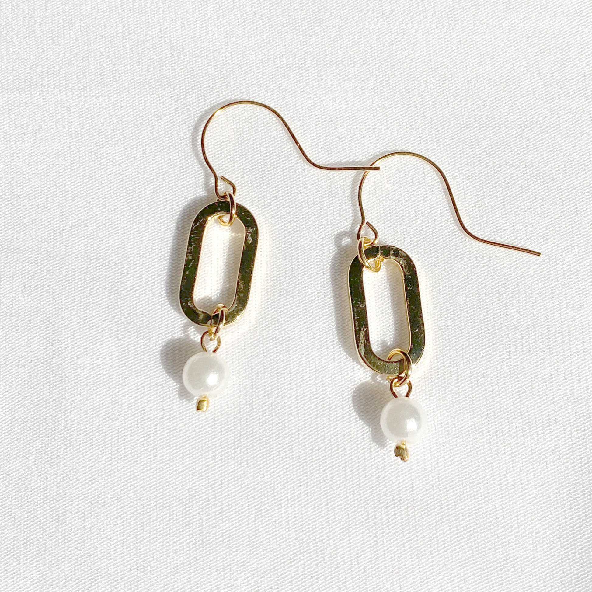 Don’t let the daily grind get you down. 24k gold plated paperclip chain with pearl drop earrings. 18k gold plated brass base.