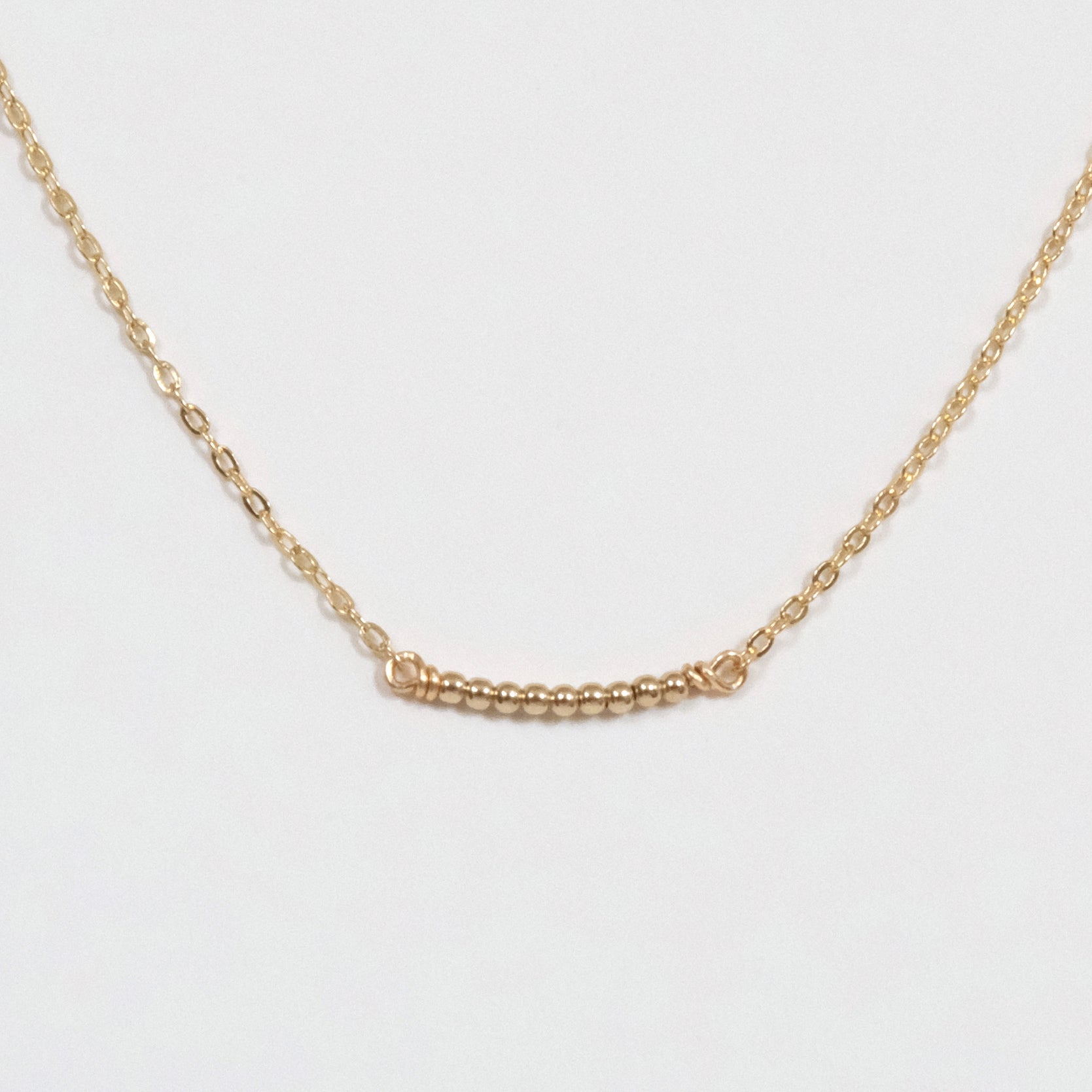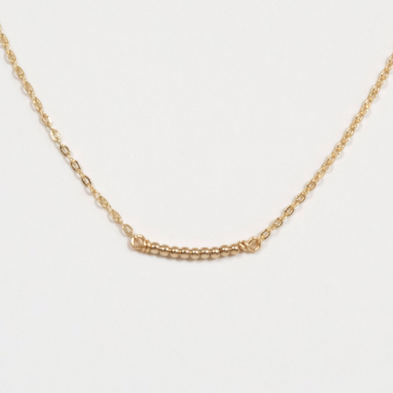 14k gold filled chain with 14k gold filled round beads on wire bar. Gold plated lobster clasp.
