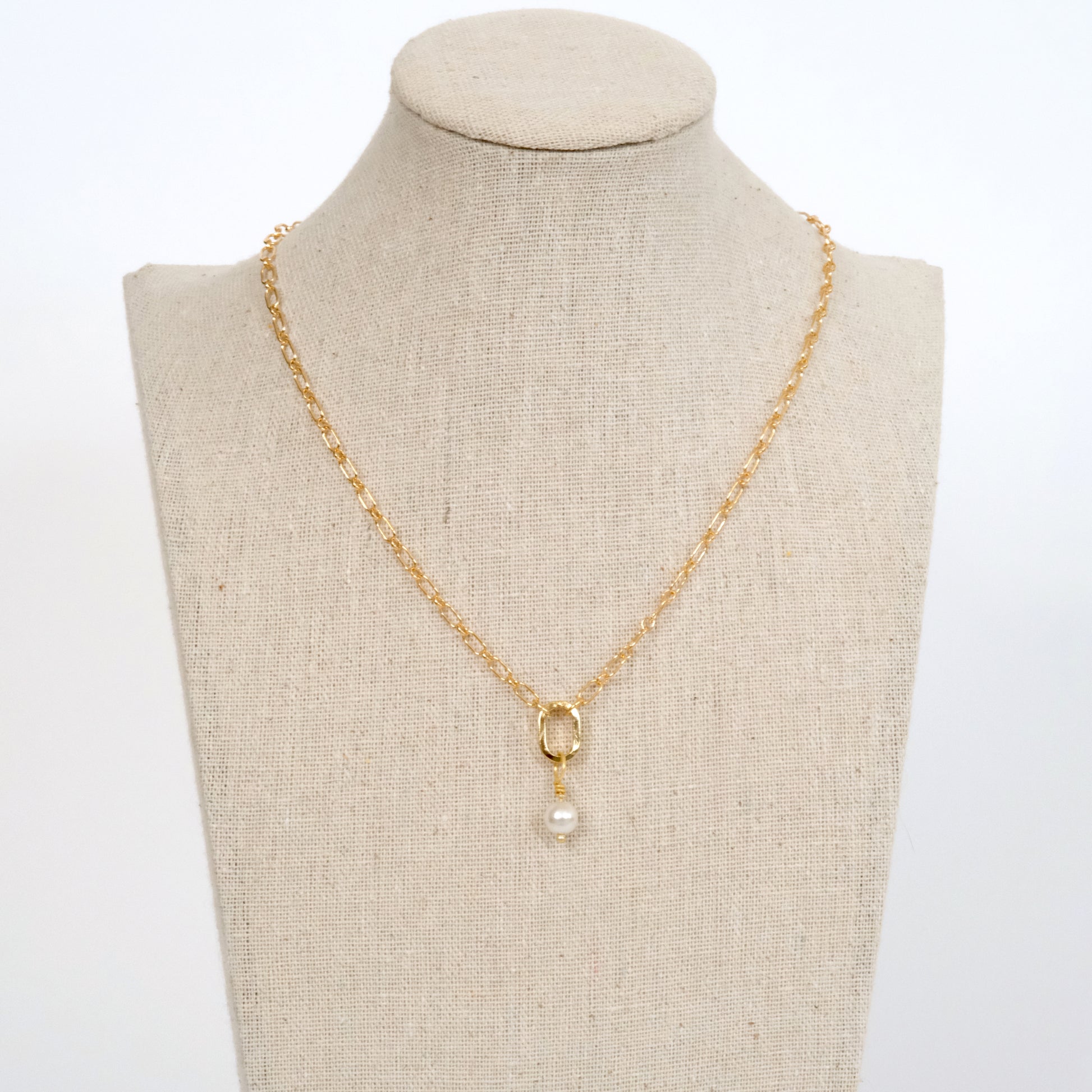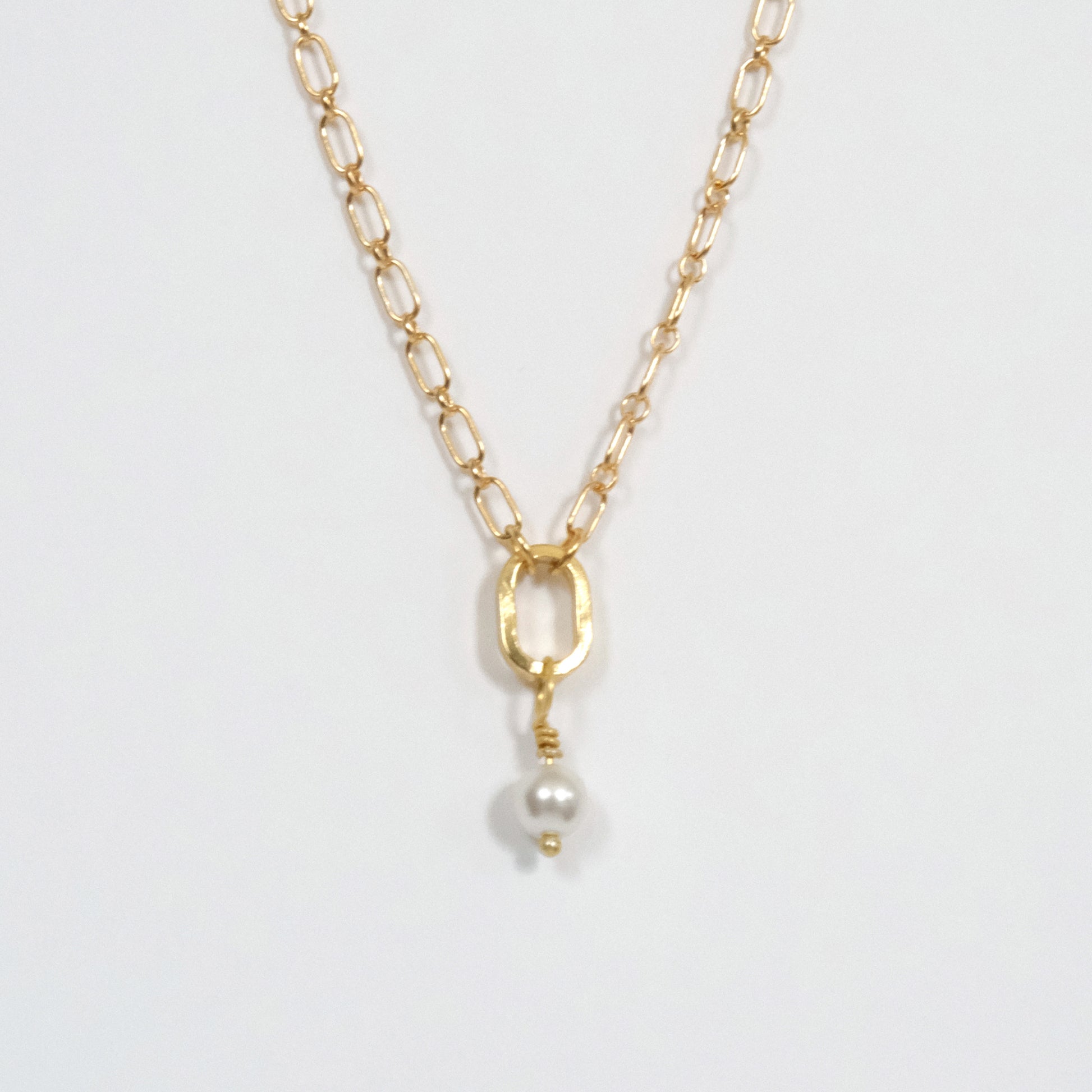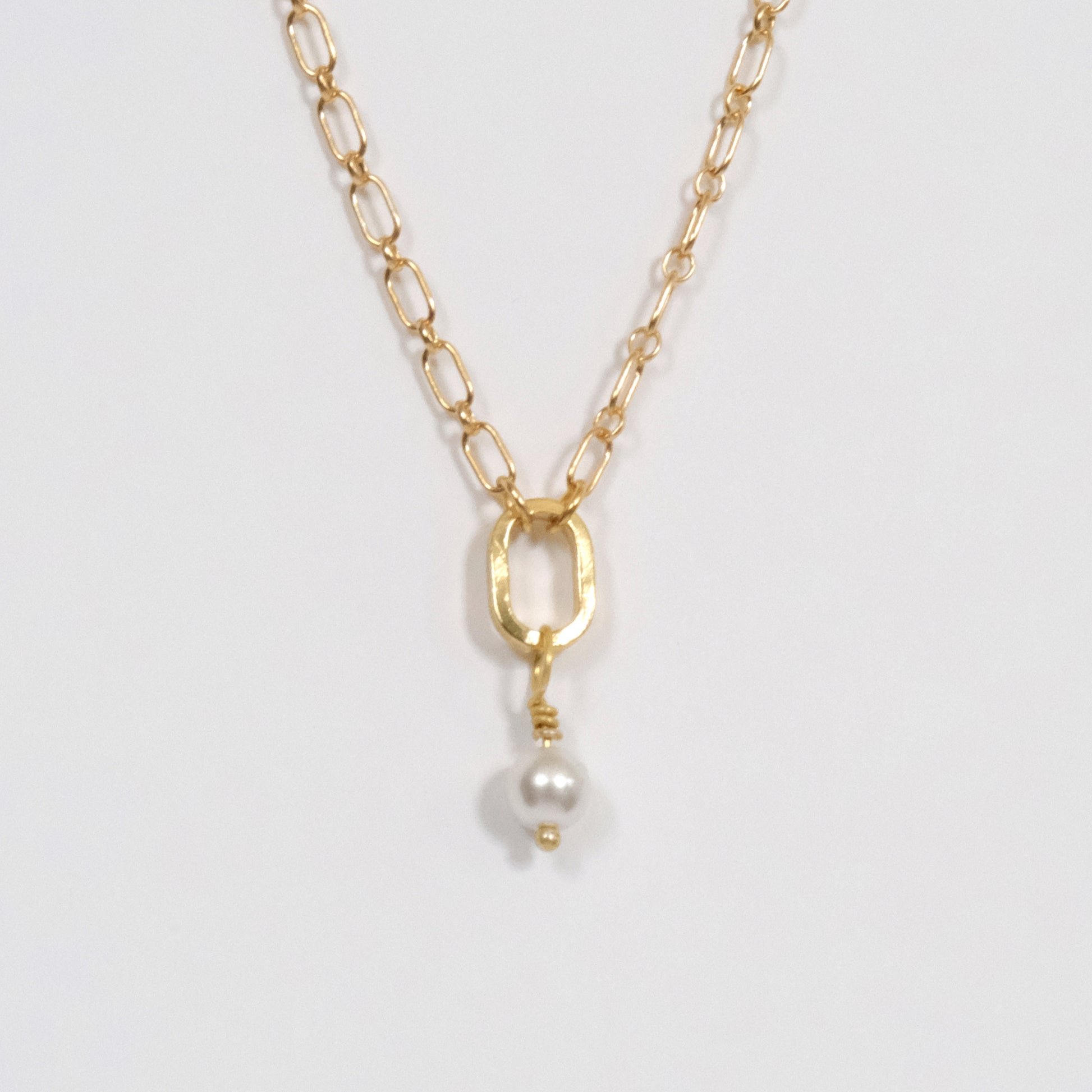 14k gold filled long and short oval chain with 24k gold plated loop and pearl bead. Gold plated lobster clasp.