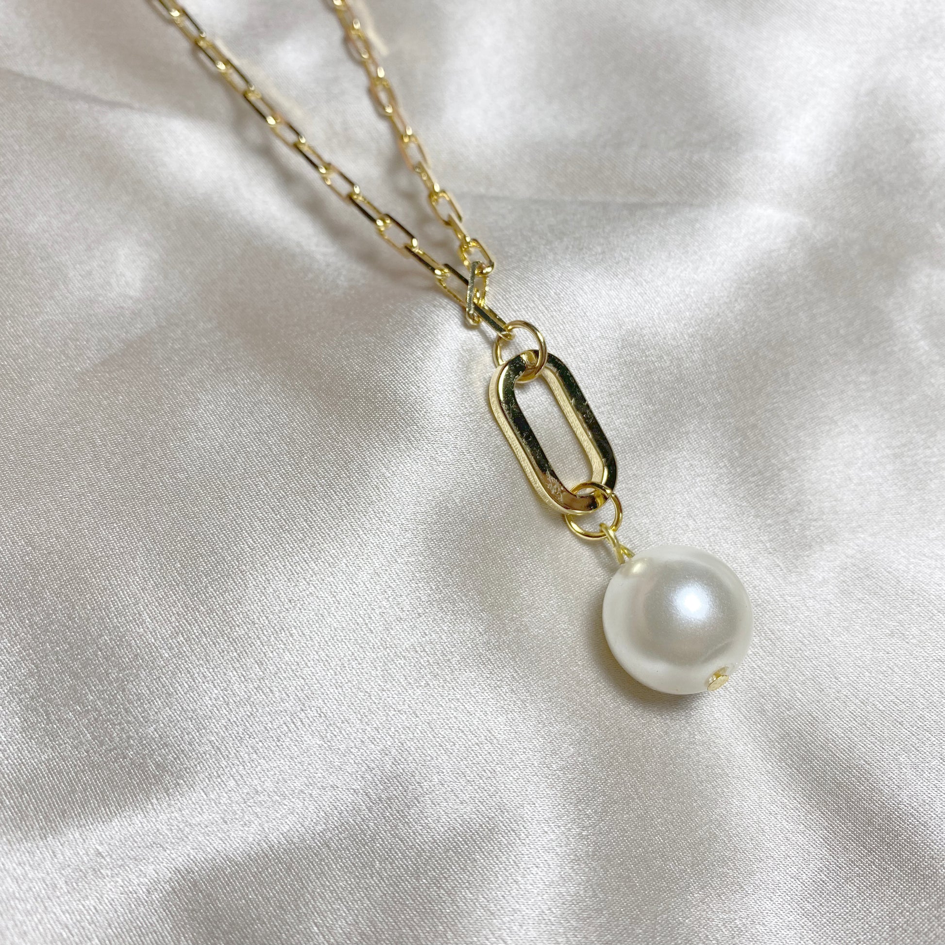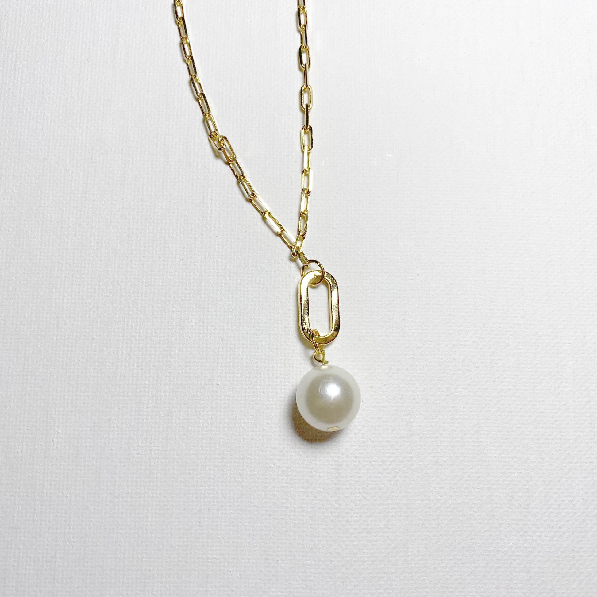 Full bodied, smooth finish. Pearl drop on 24k gold plated paperclip chain. Gold plated lobster clasp.
