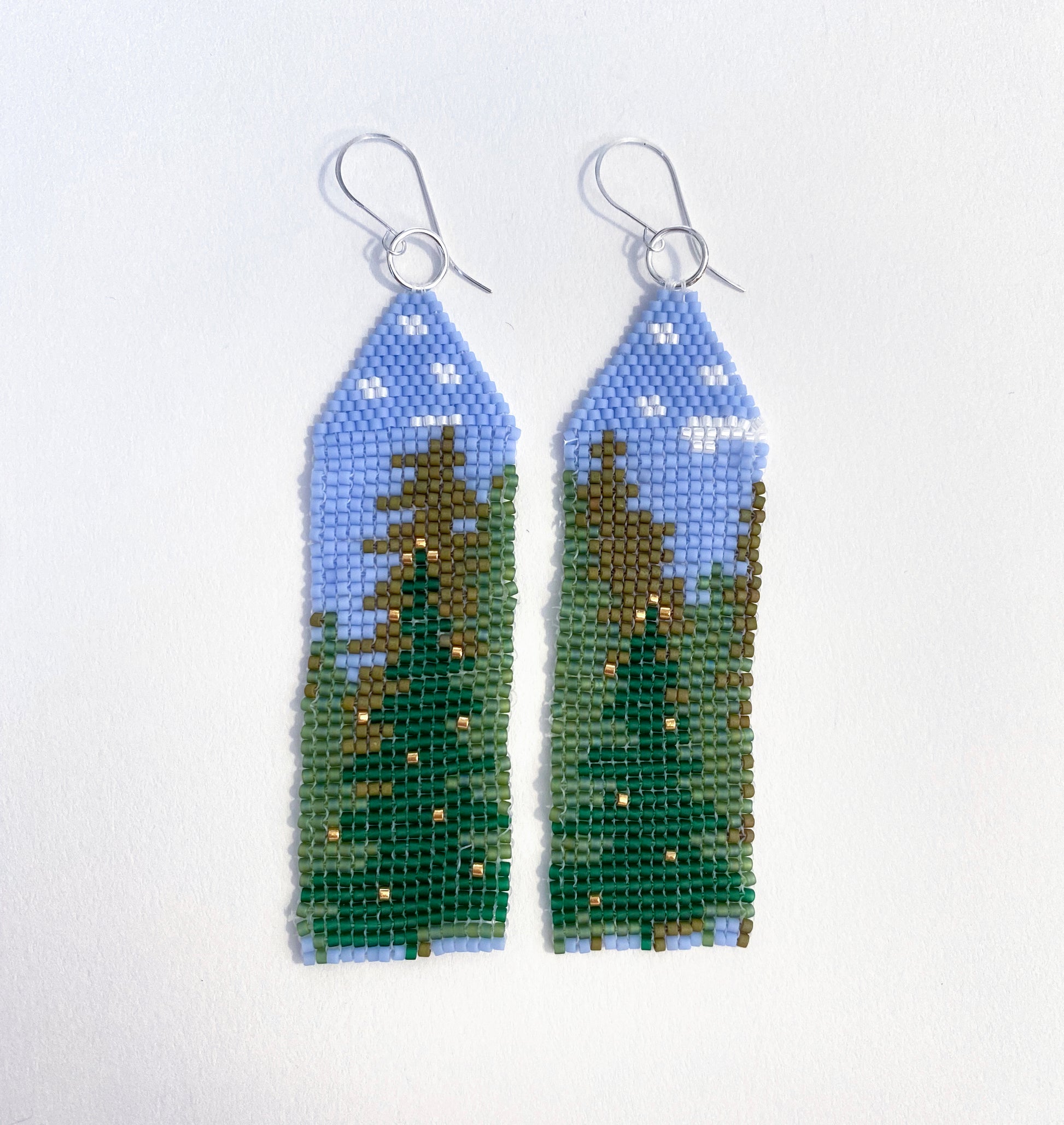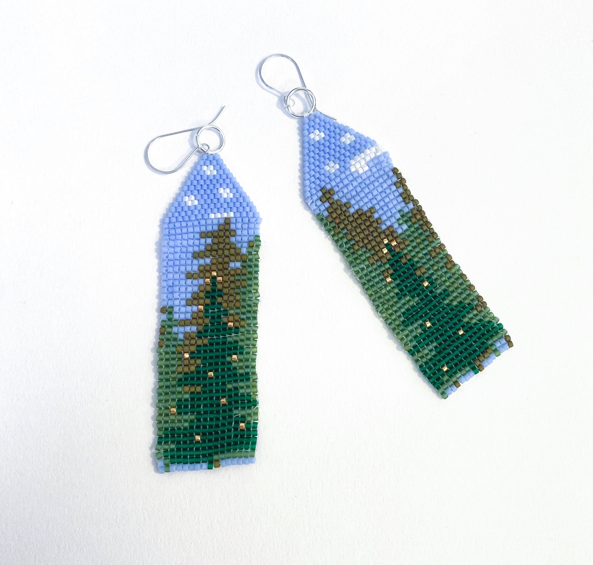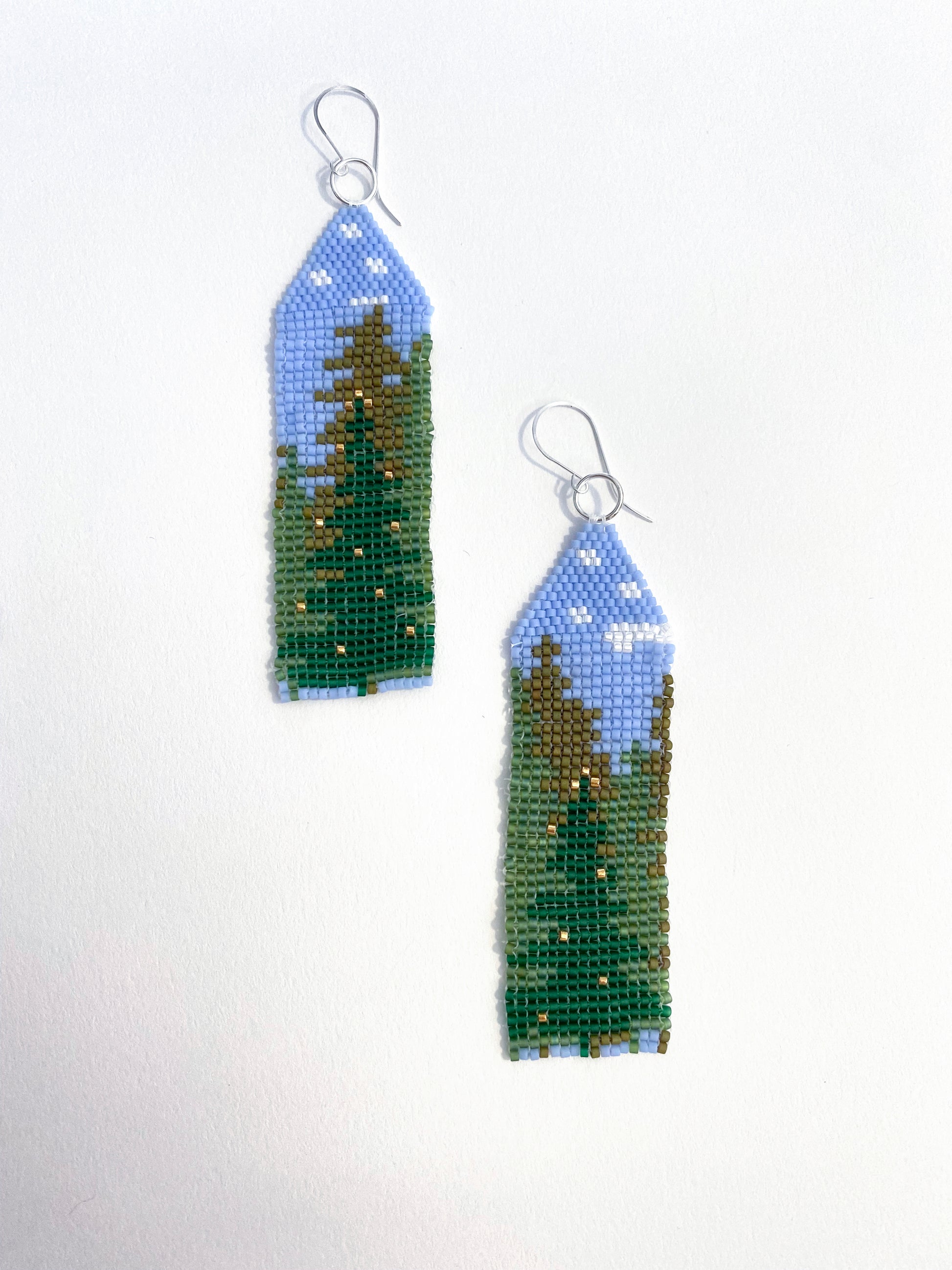 Epic illustrated landscape earrings. A green forest with a lit christmas tree - seasonal, but wearable year-round. Silver plated wire earring base.