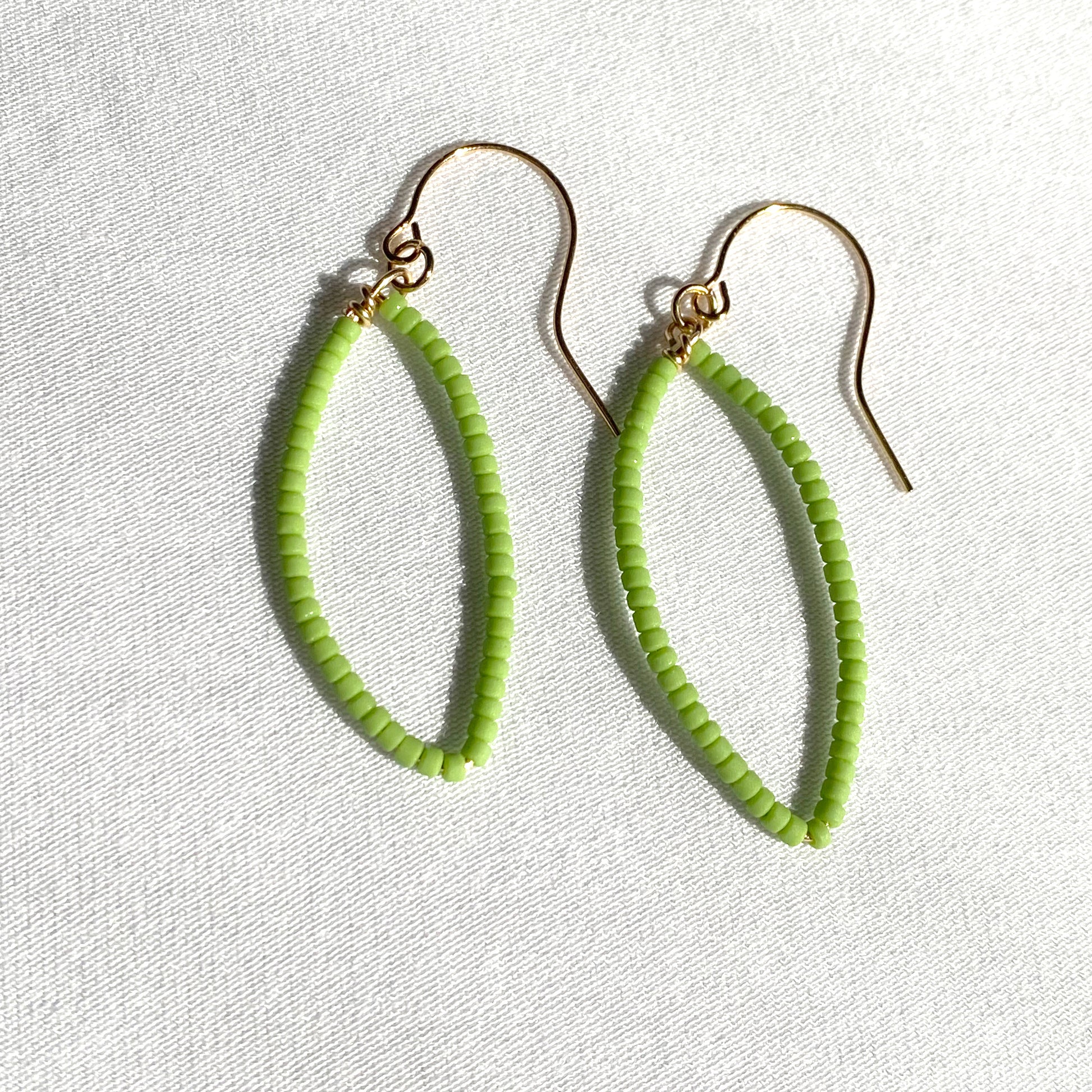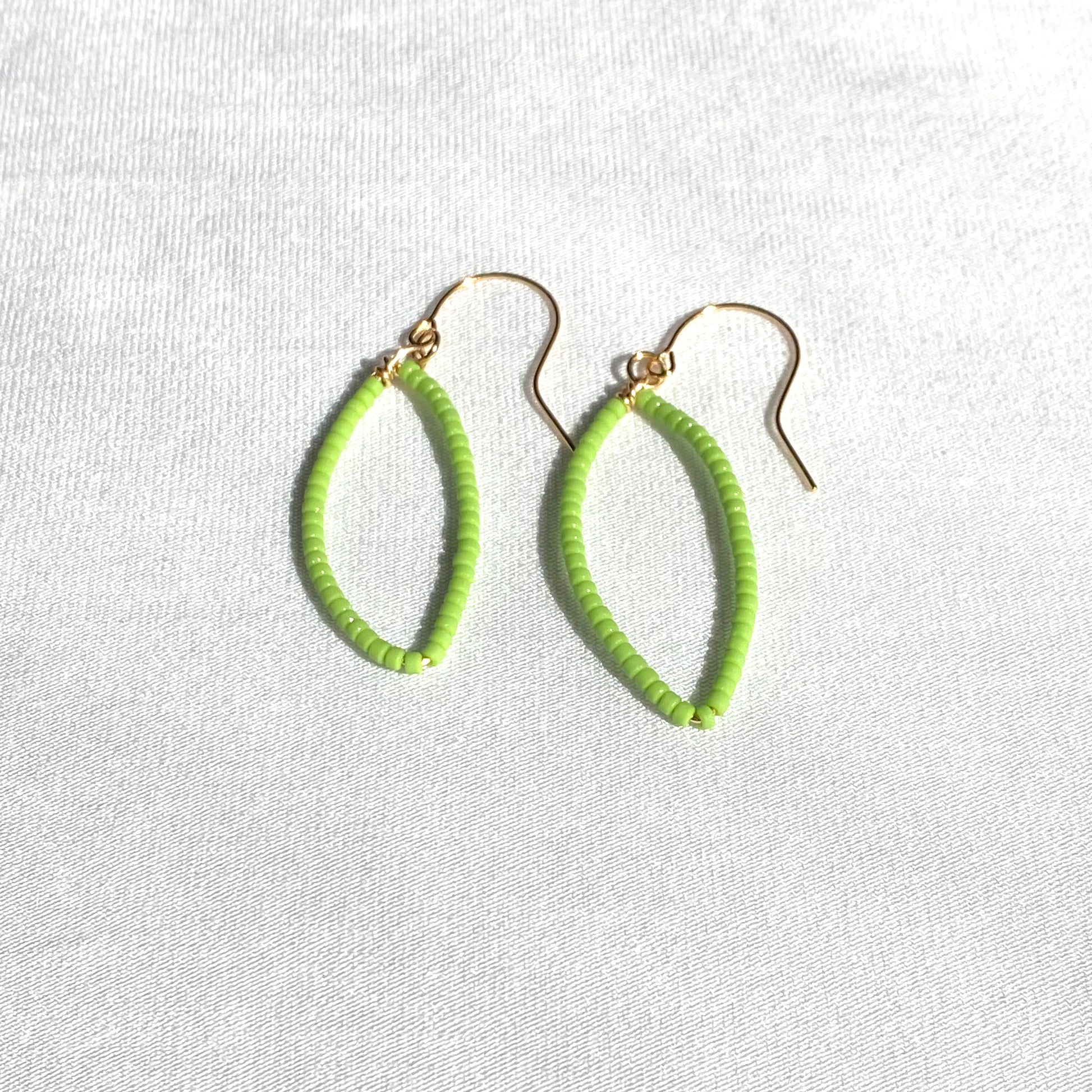 Catch that last bit of summer. Tiny lime green Afghani tribal beads on gold wire in leaf shape. 18k gold plated brass base.