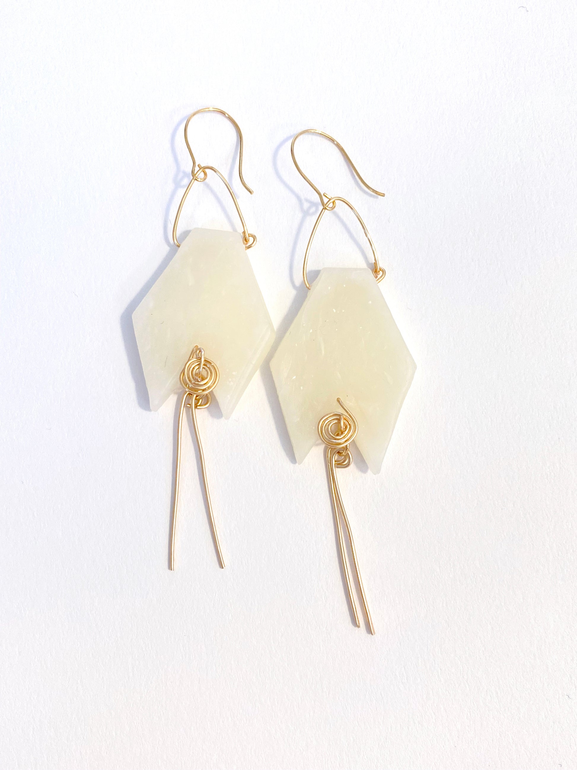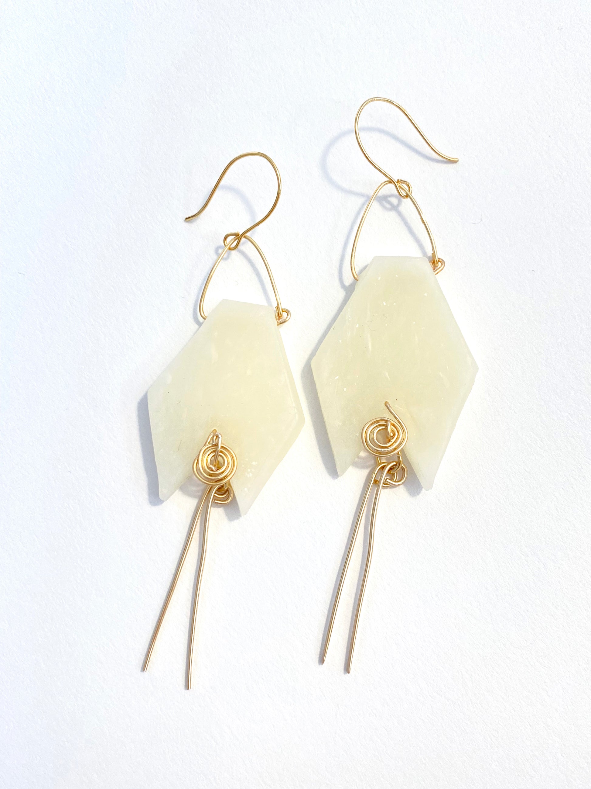 Lightweight smooth ceramic earrings contrast with delicate gold wire. 18k gold plated earring base.