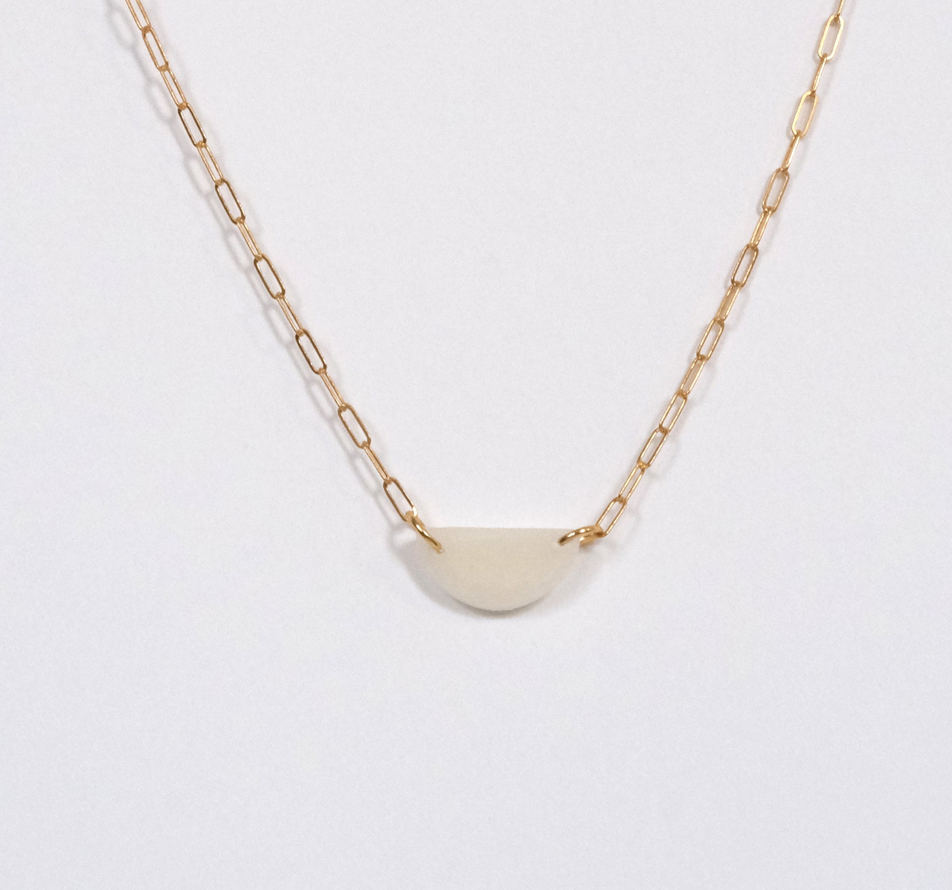 Ceramic half-moon on delicate 14k gold filled paperclip chain. Gold plated lobster clasp.