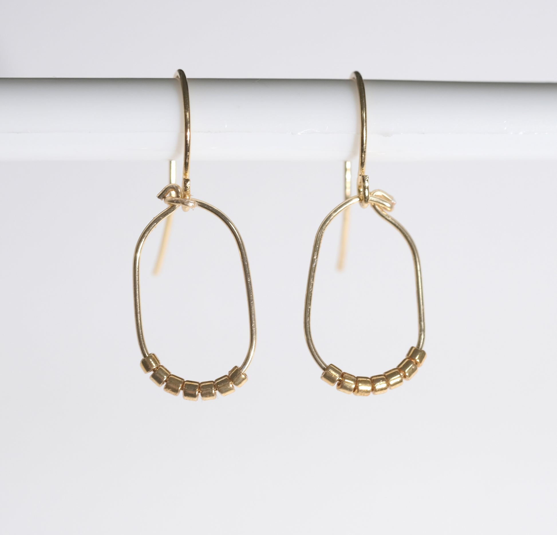Shining delicate gold glass beads on gold plated wire ovals. 18k gold plated earring wire.