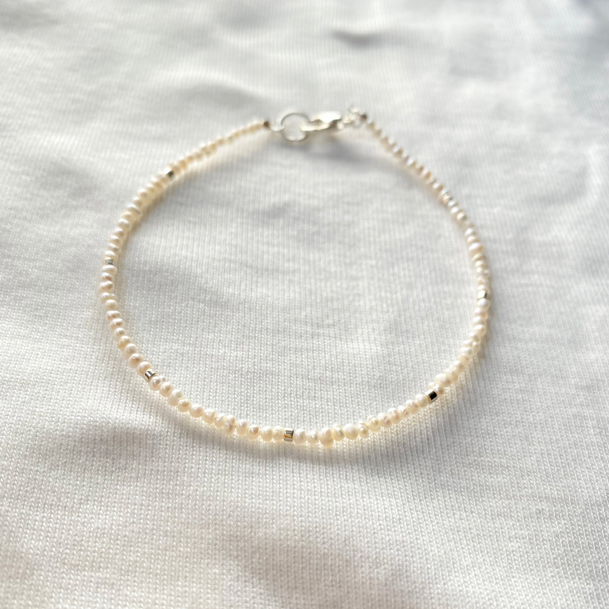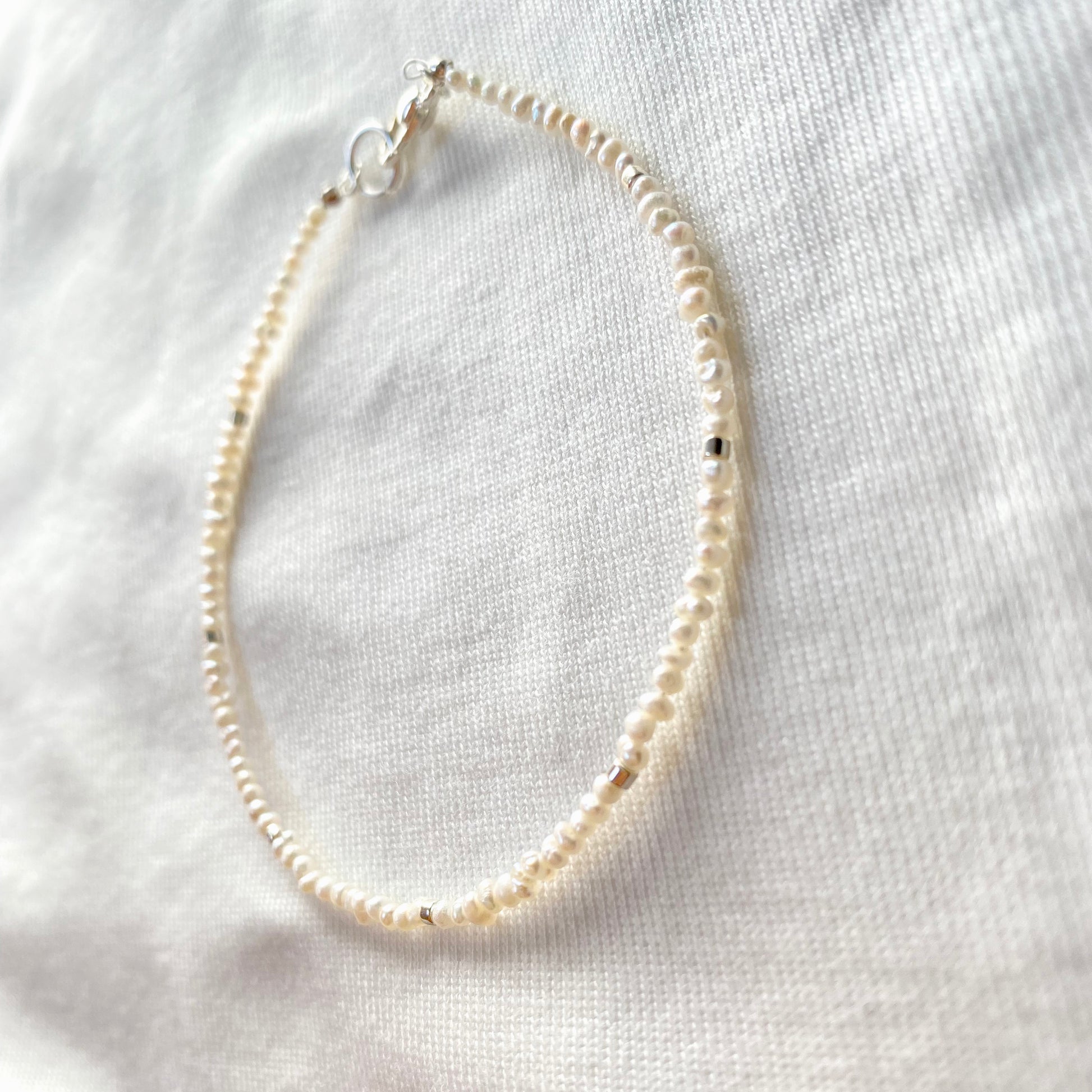 Just a touch of silver amidst delicate, teeny tiny pearls. AAA-rated pearls, glass beads. Silver lobster clasp.