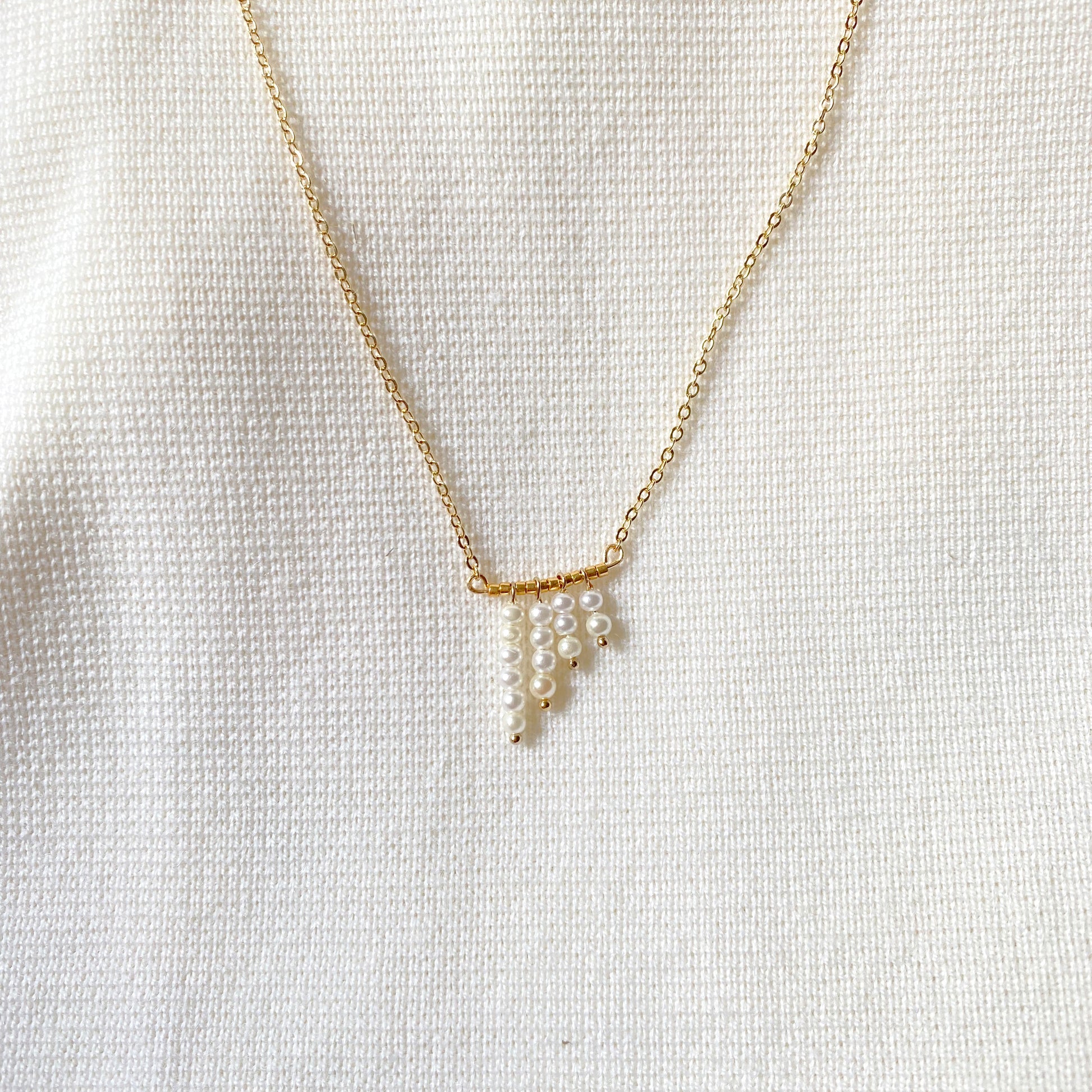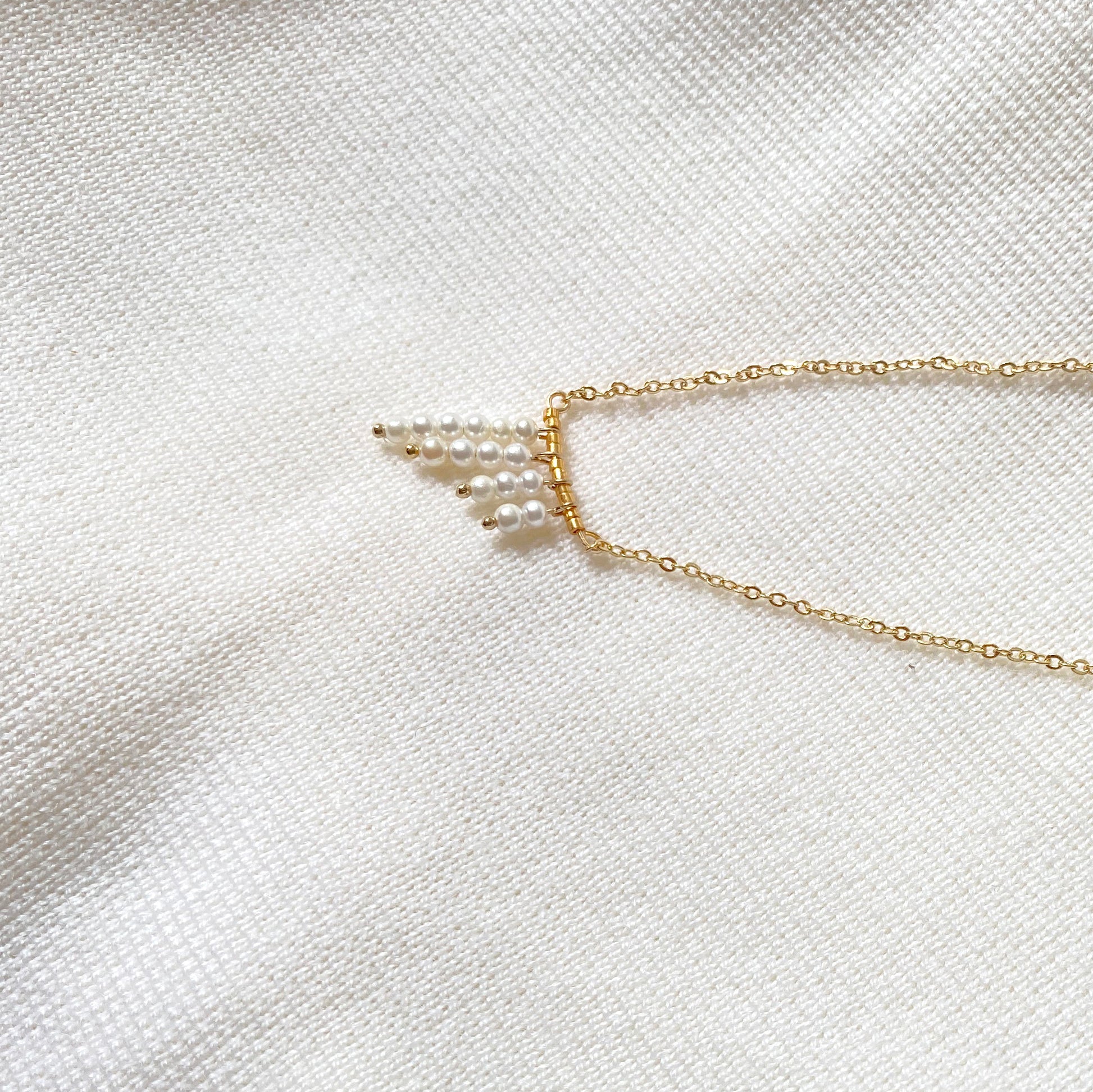 Playful, musical, and one of a kind. 14k gold filled chain, tiny pearls, gold glass beads. Gold plated lobster clasp.