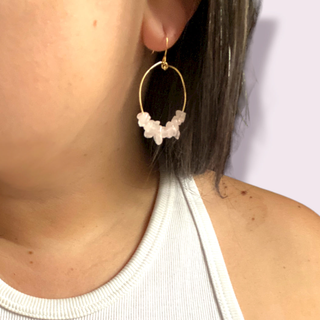 A landscape made of rose quartz. Gold hoops. 18k gold plated earring base.