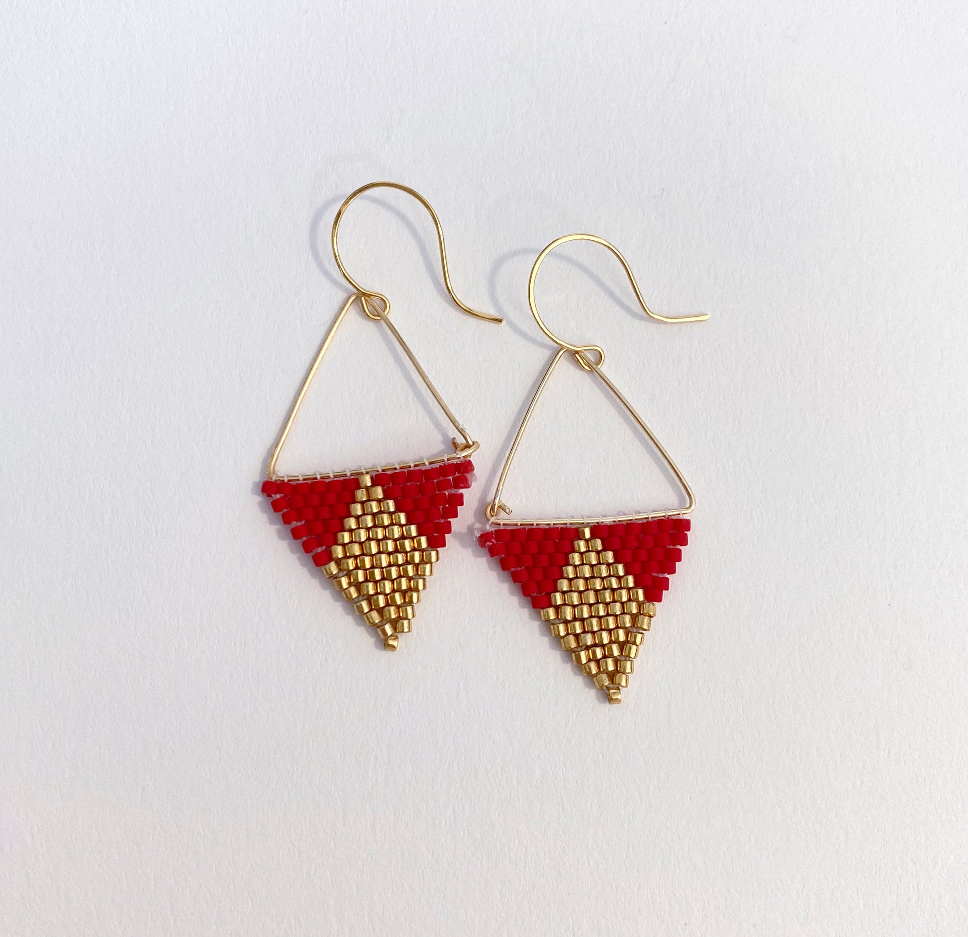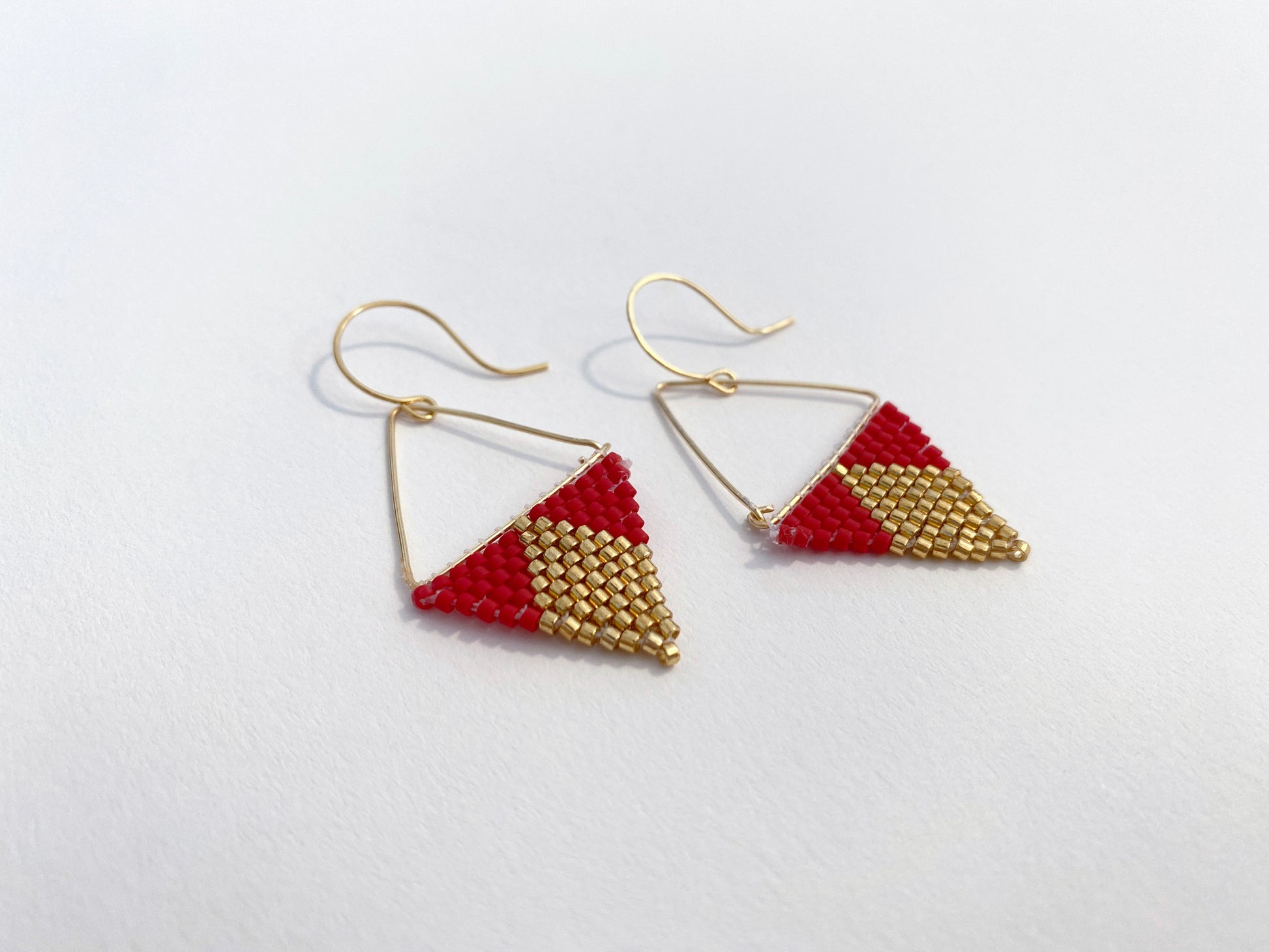 Delicate beaded earrings form diamond and triangle shapes on gold wire. Matte red and shiny gold glass beads. 18k gold plated earring base.