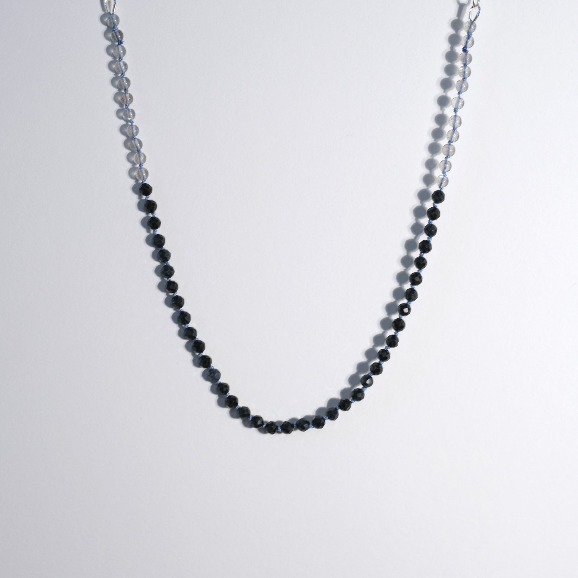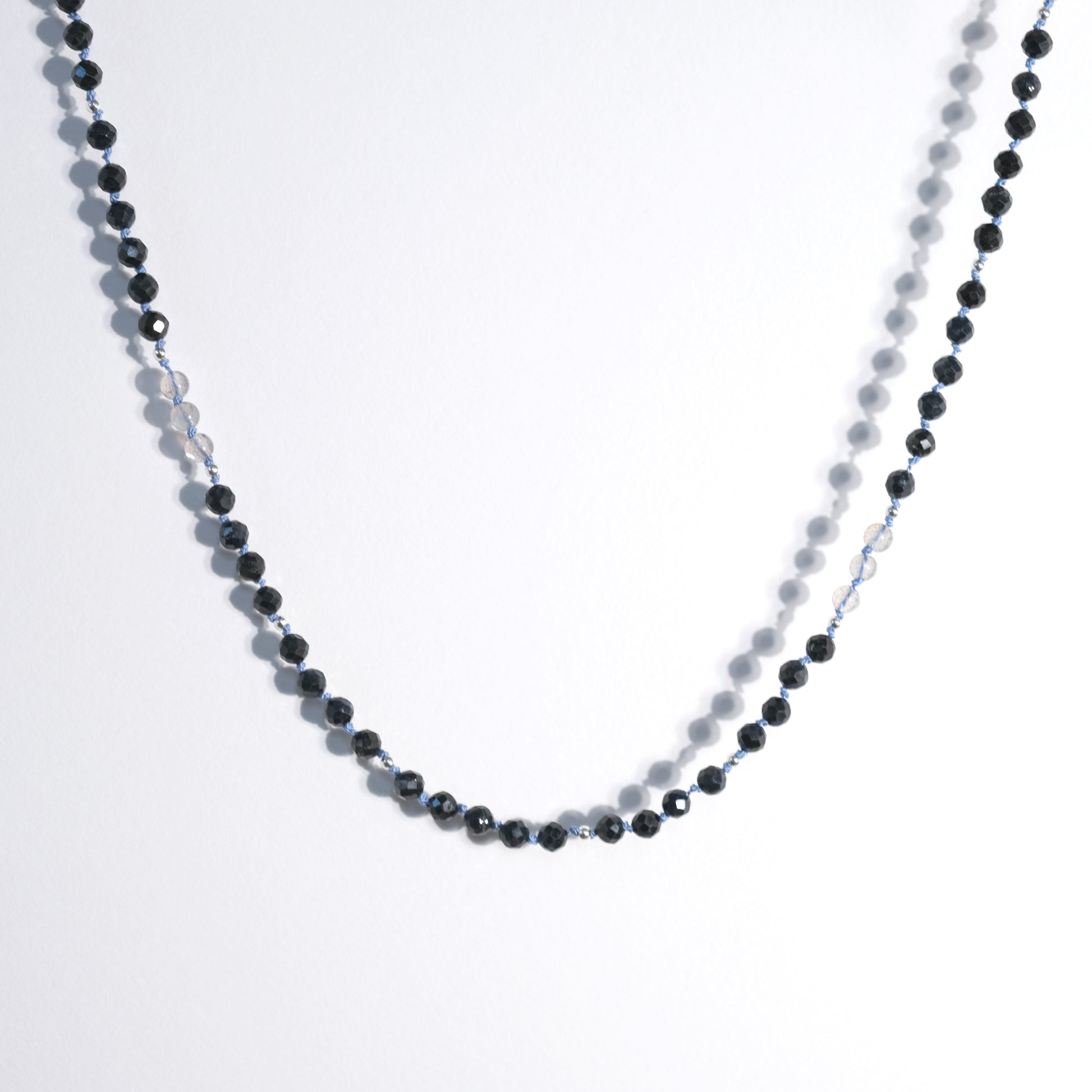 This necklace is strung on blue silk thread, knotted for extra security. The clasp is sterling silver. The necklace measures 21 inches including clasp.