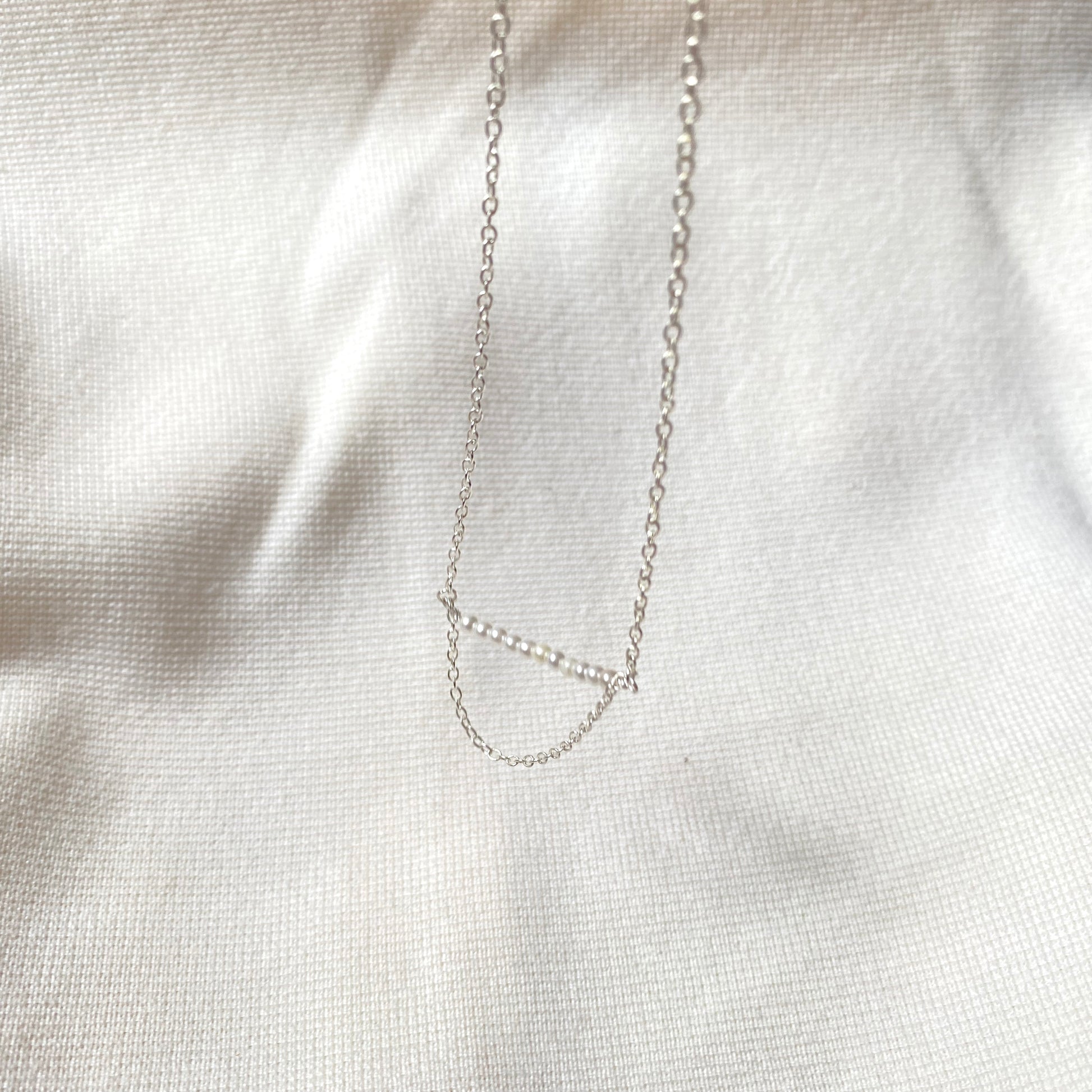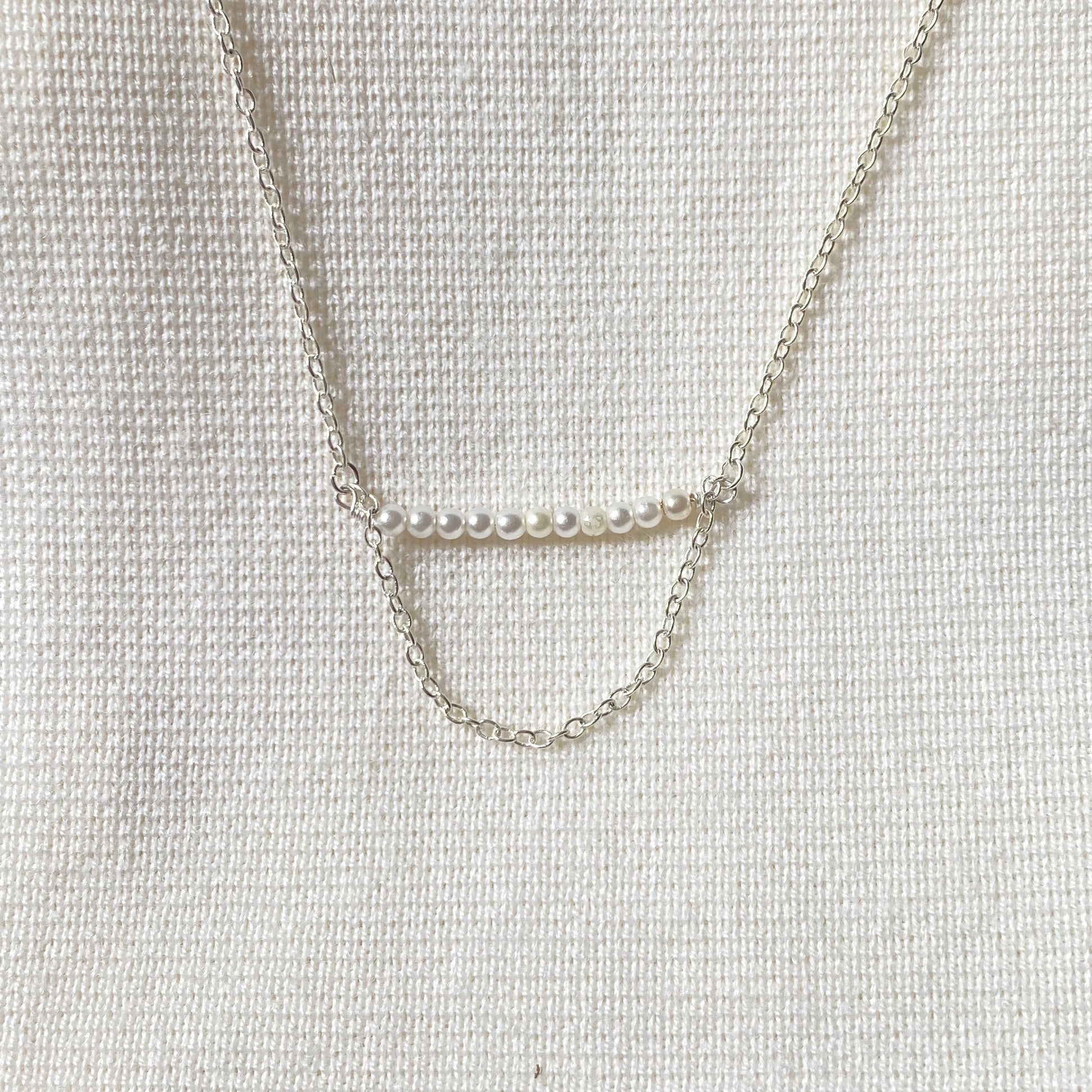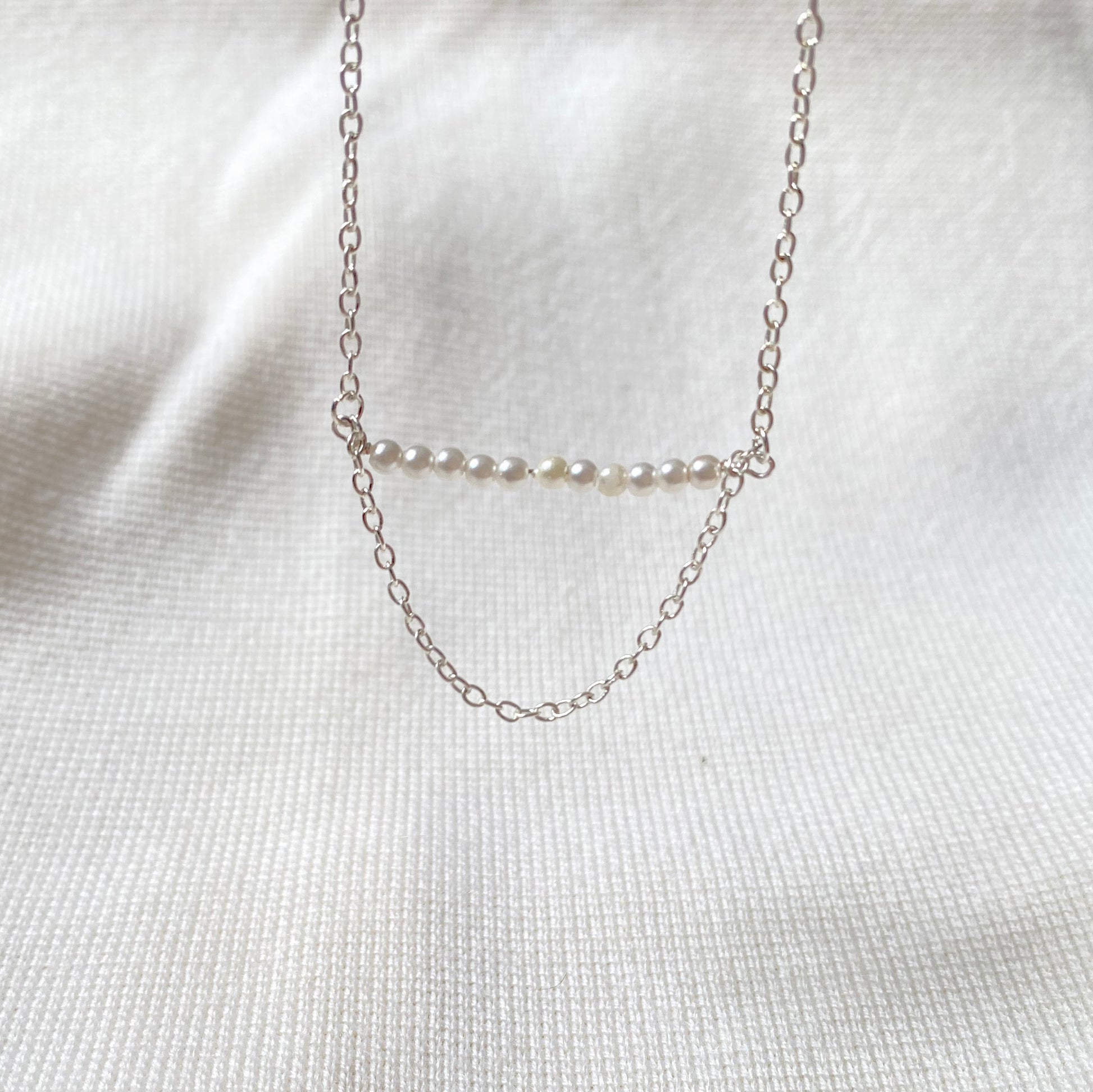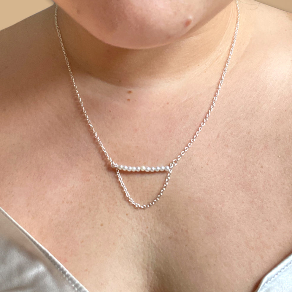 Like the Pearl Half Moon Necklace, but more silvery. Delicate round pearls create a bridge across silver chain (brass, nickel-free). Silver plated lobster clasp.