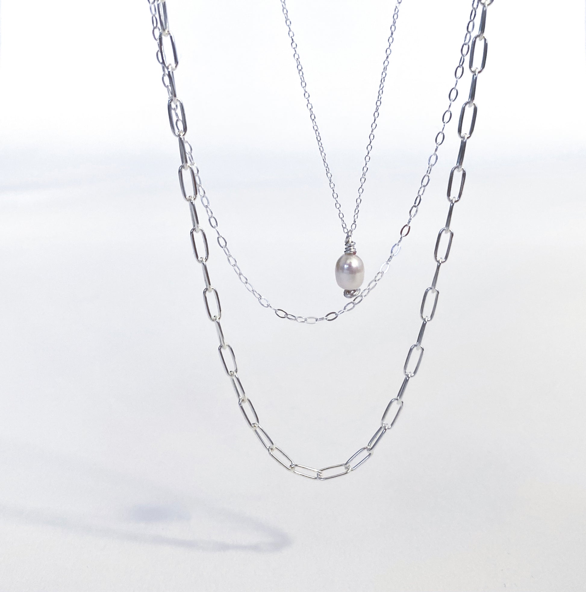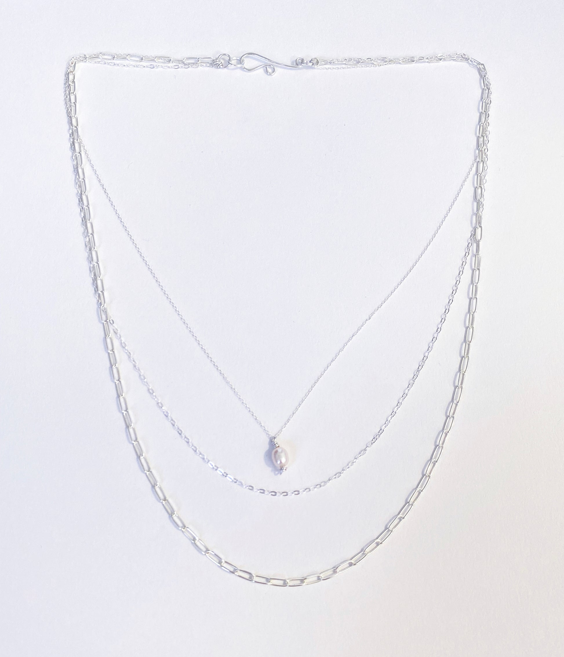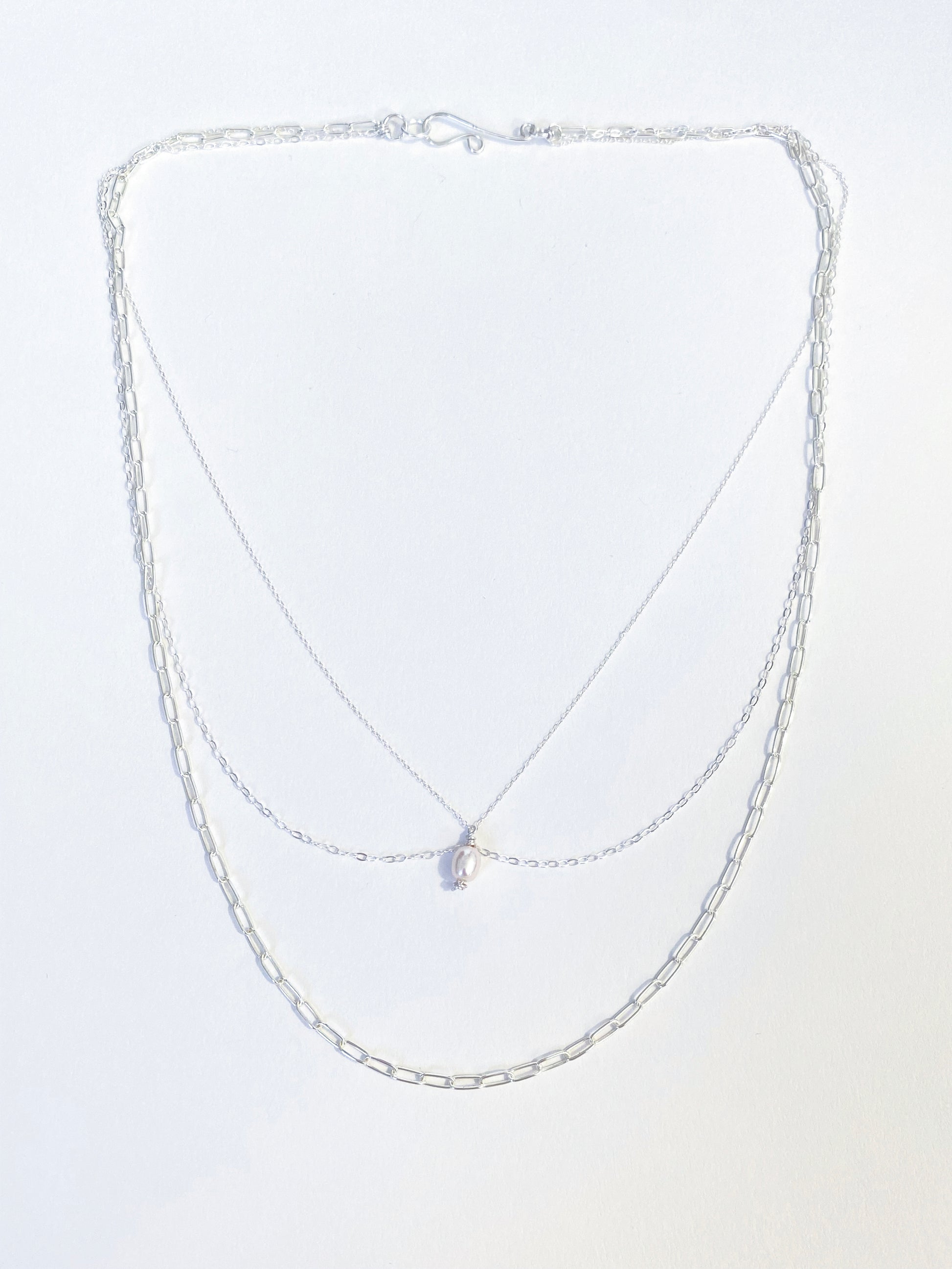 A delicate sterling silver 3-piece layering necklace. Featuring from longest to shortest: sterling silver paperclip chain, sterling silver cable chain, and delicate sterling silver chain with single AAA rice pearl drop.