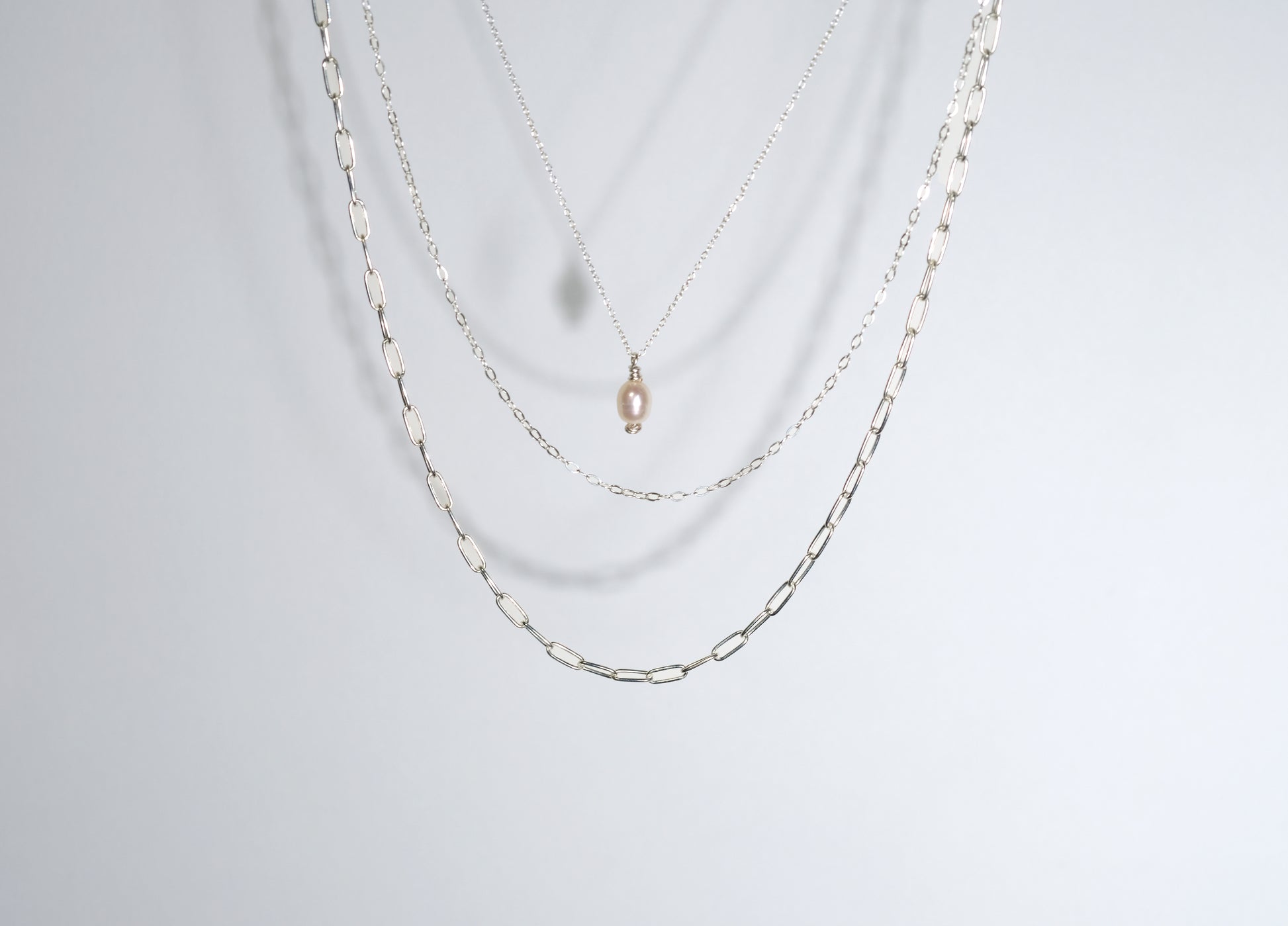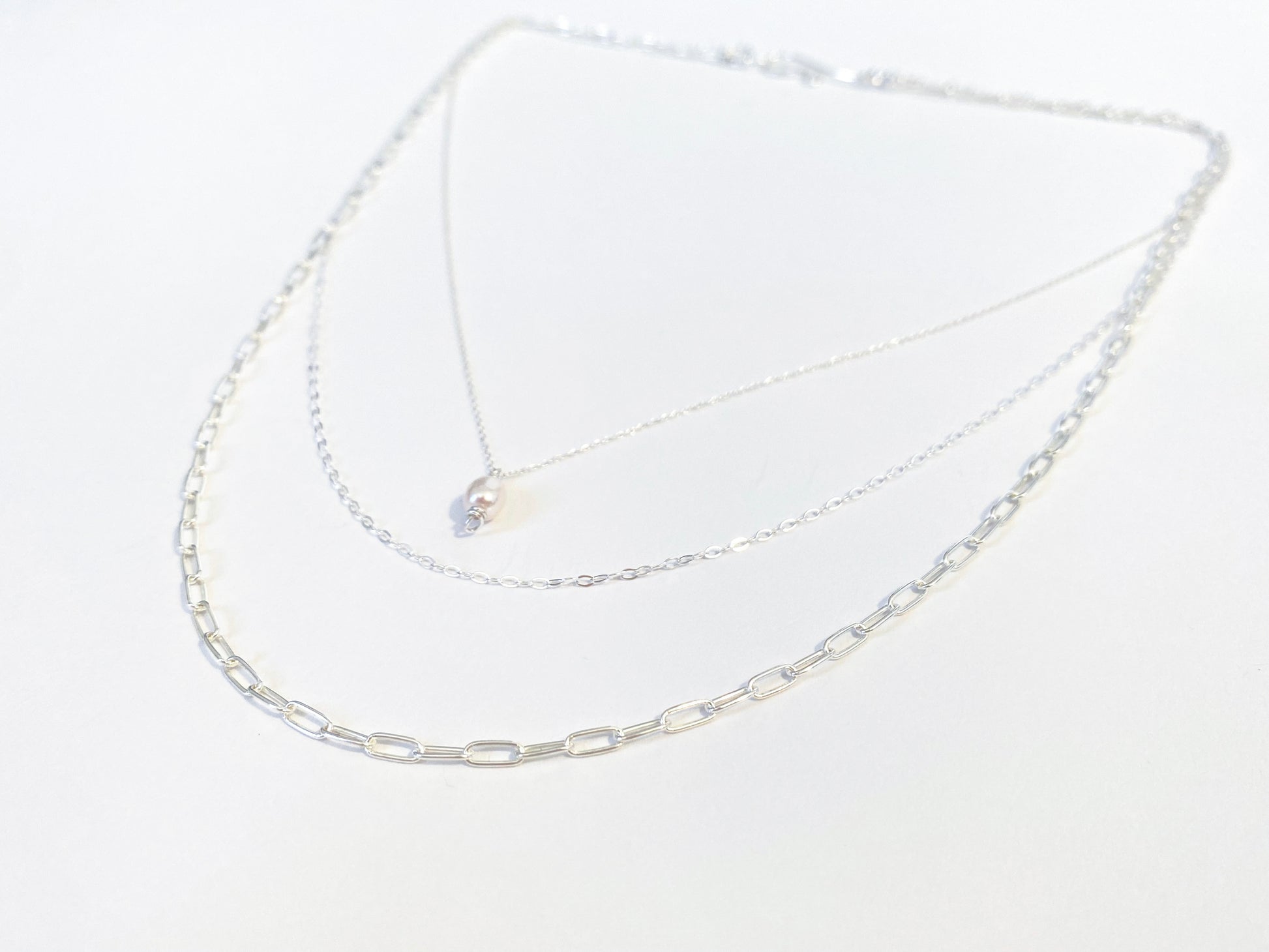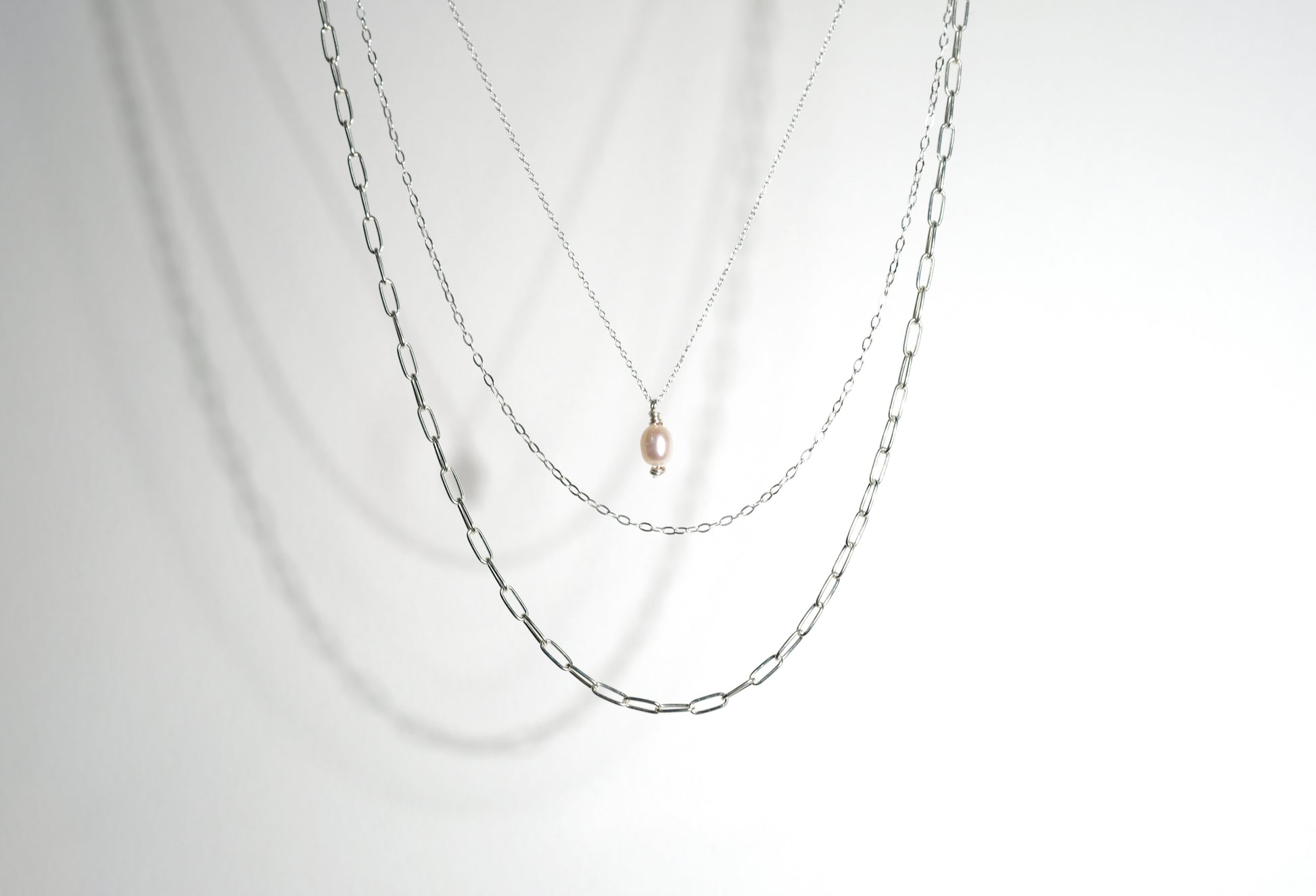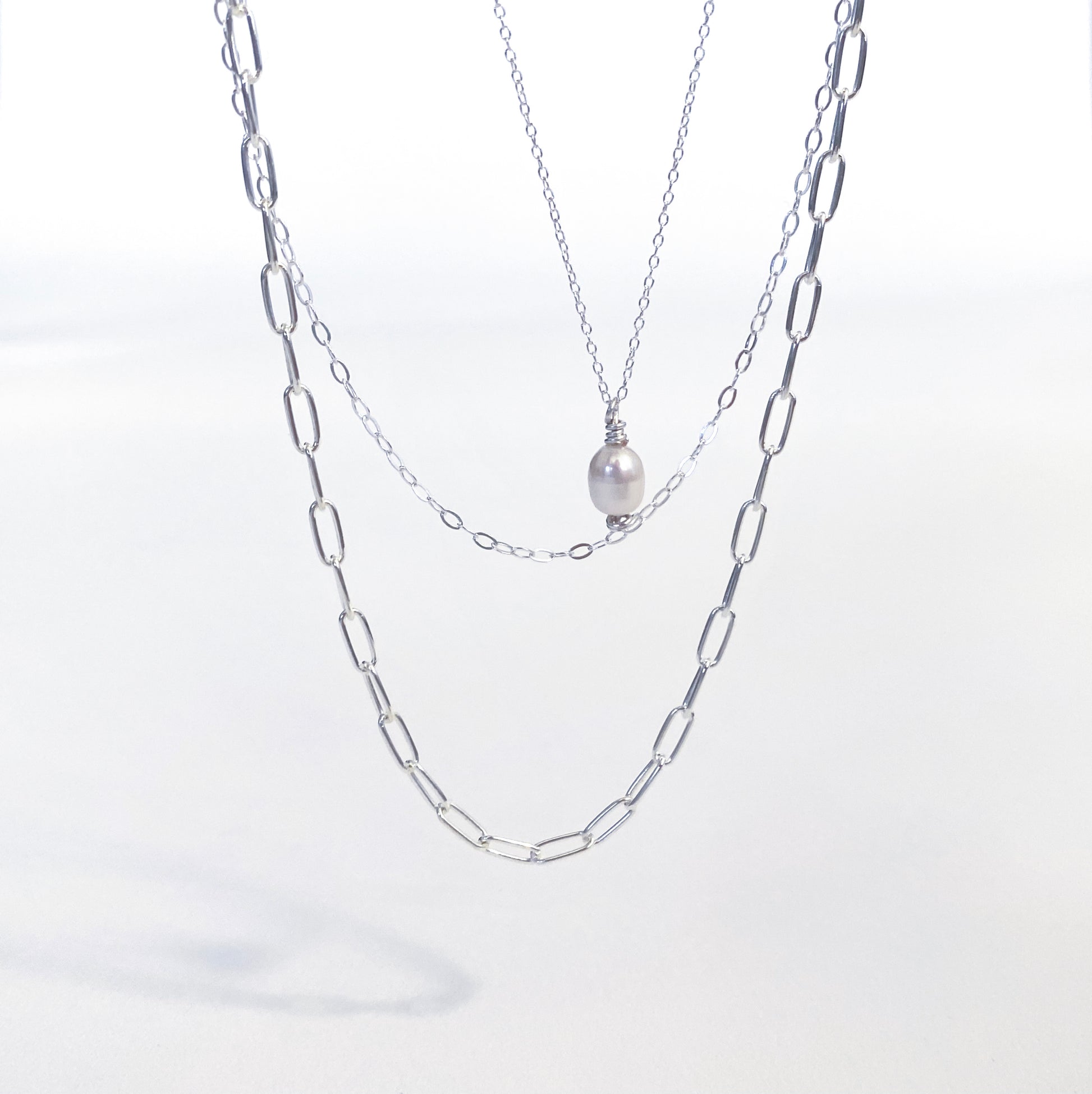 A delicate sterling silver 3-piece layering necklace. Featuring from longest to shortest: sterling silver paperclip chain, sterling silver cable chain, and delicate sterling silver chain with single AAA rice pearl drop.