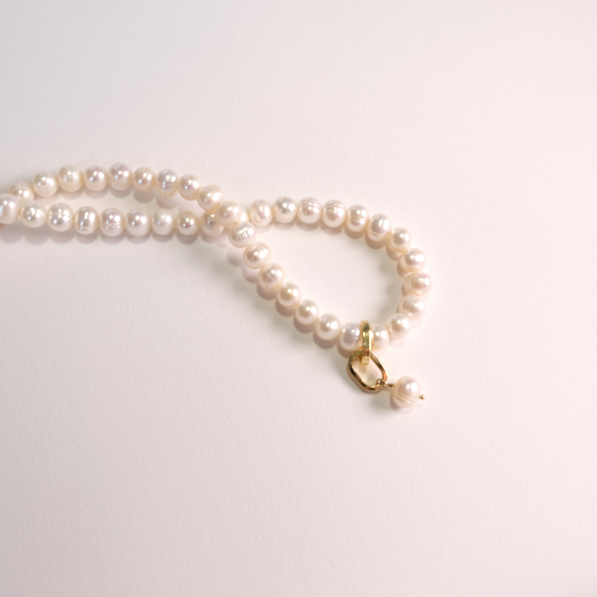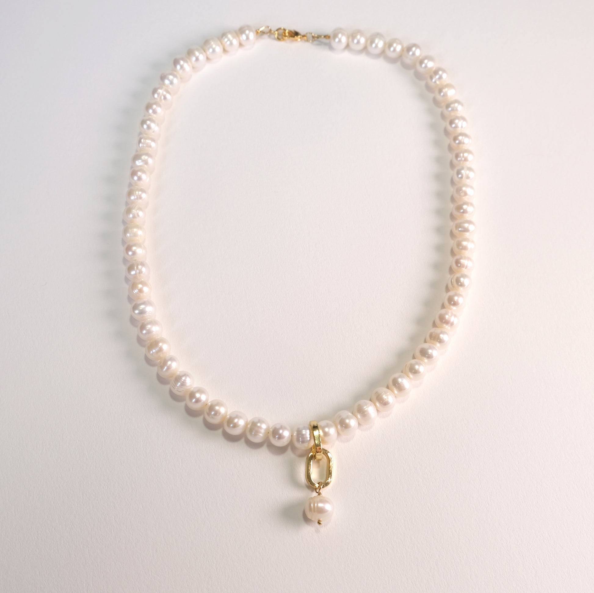 A Sunday(-ae) special treat. White round pearls drape beautifully. Classic style updated with centered 24k gold plated paperclip chain loops. Gold plated lobster clasp.