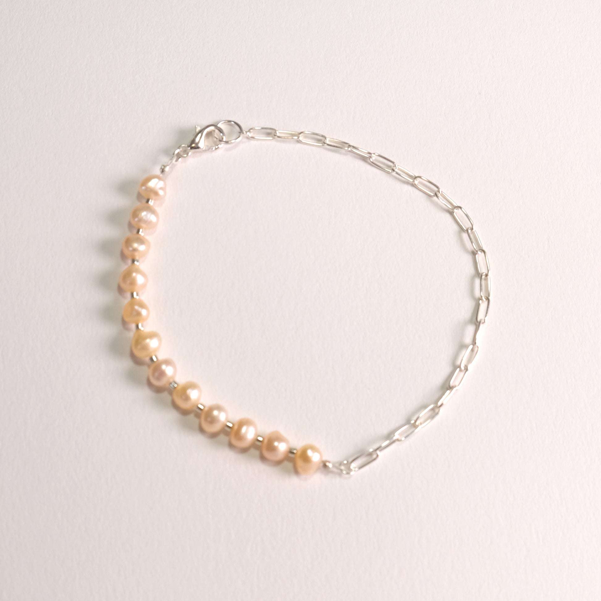 Peach pink pearls balance with sterling silver paperclip chain in this trendy look. Silver plated lobster clasp.